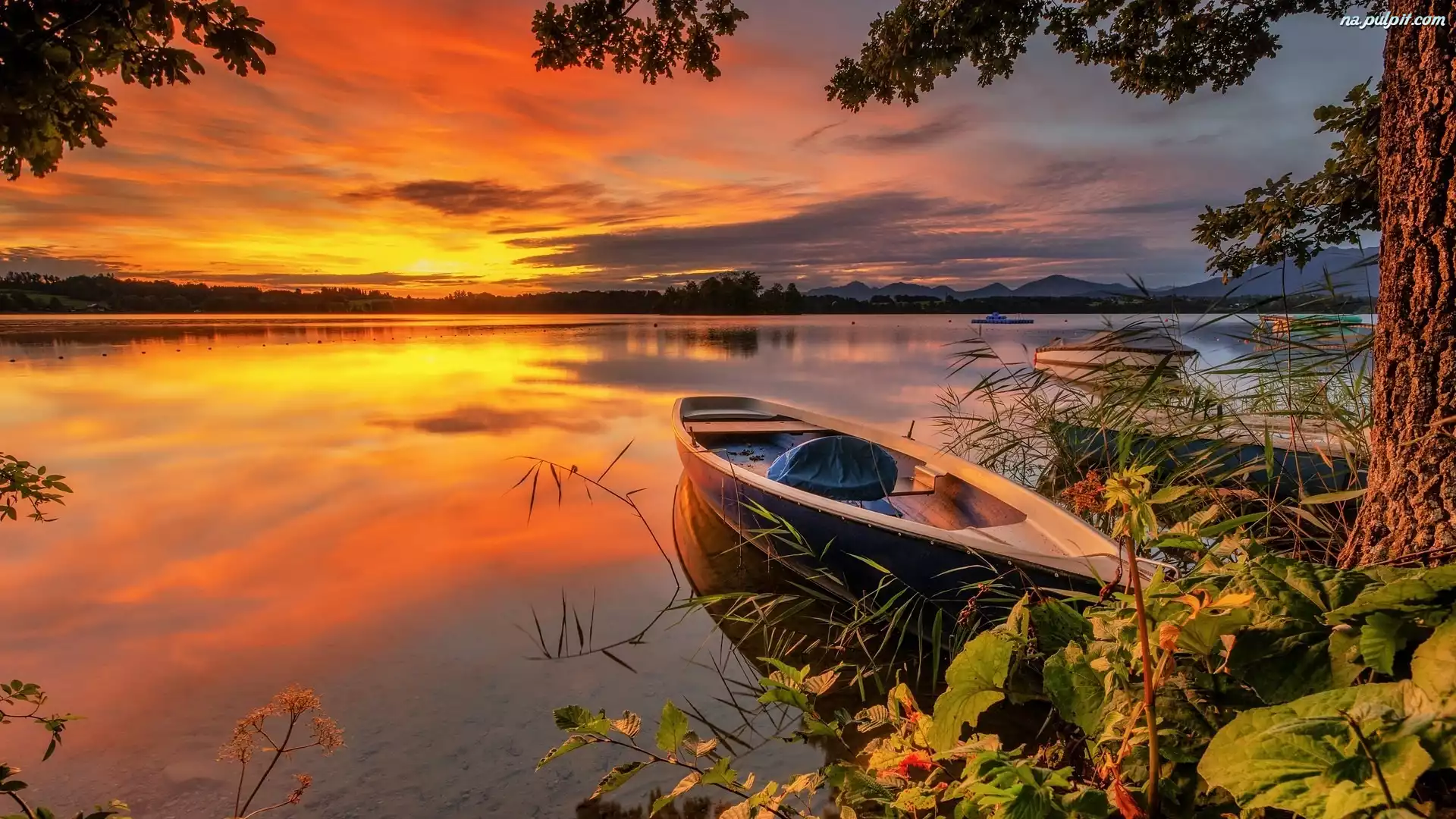 Drzewa, Zachód słońca, Jezioro, Rośliny, Łódki Na Pulpit