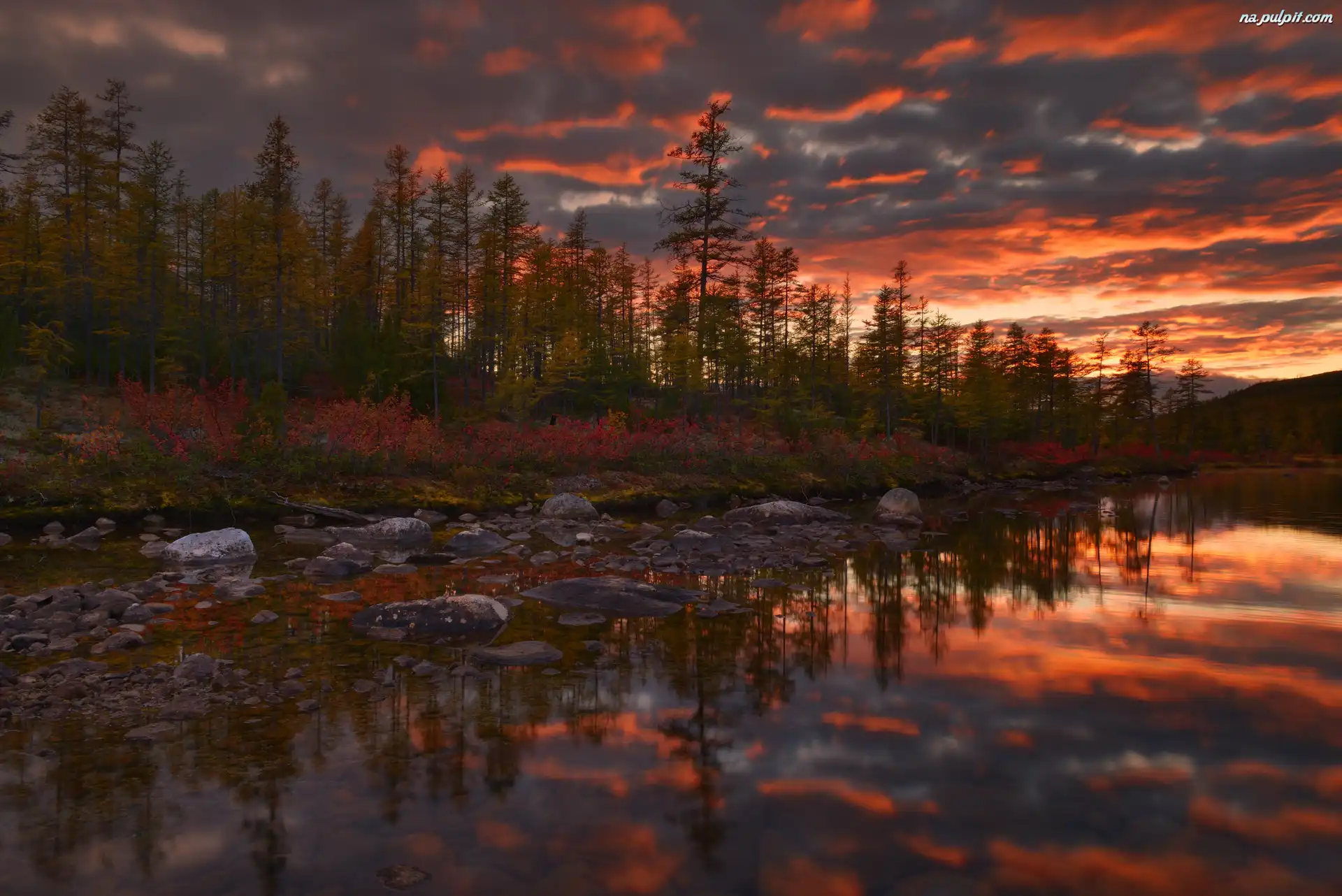 Zachód Słońca, Jezioro Jack London, Rosja, Kamienie, Drzewa, Kołyma, Jesień, Niebo