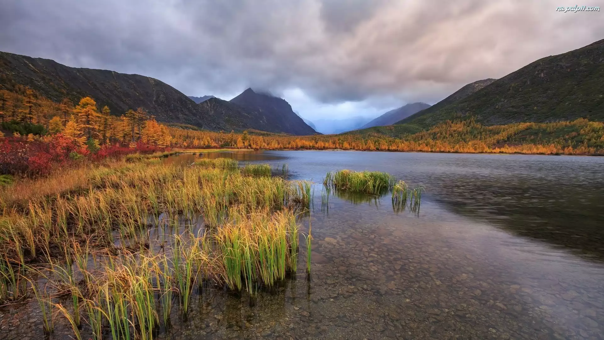 Jezioro, Kołymskie, Kołyma, Jesień, Rosja, Obwód magadański, Góry, Drzewa Na Pulpit