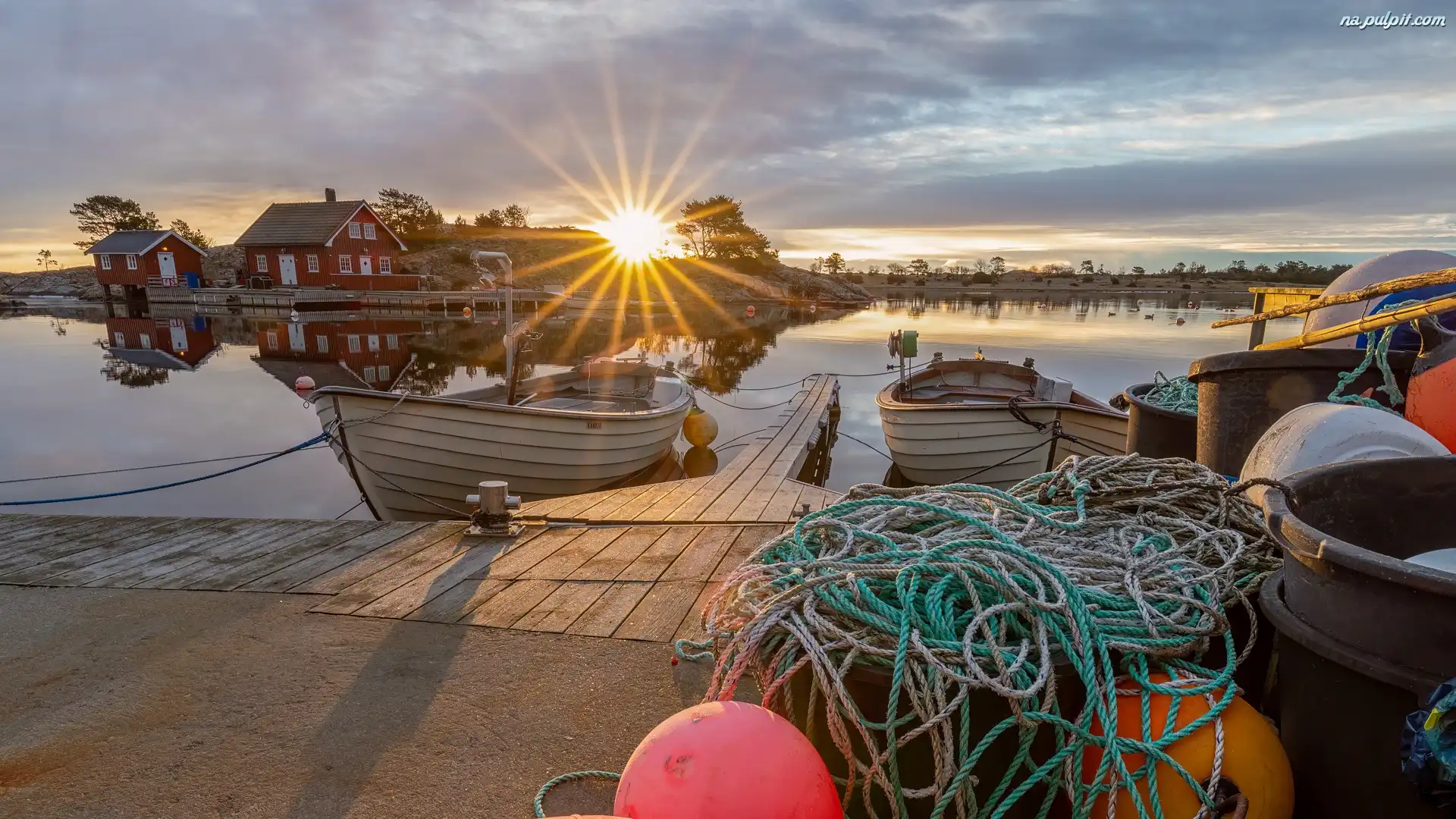 Pomost, Promienie słońca, Jezioro, Łódki, Domy, Sieć