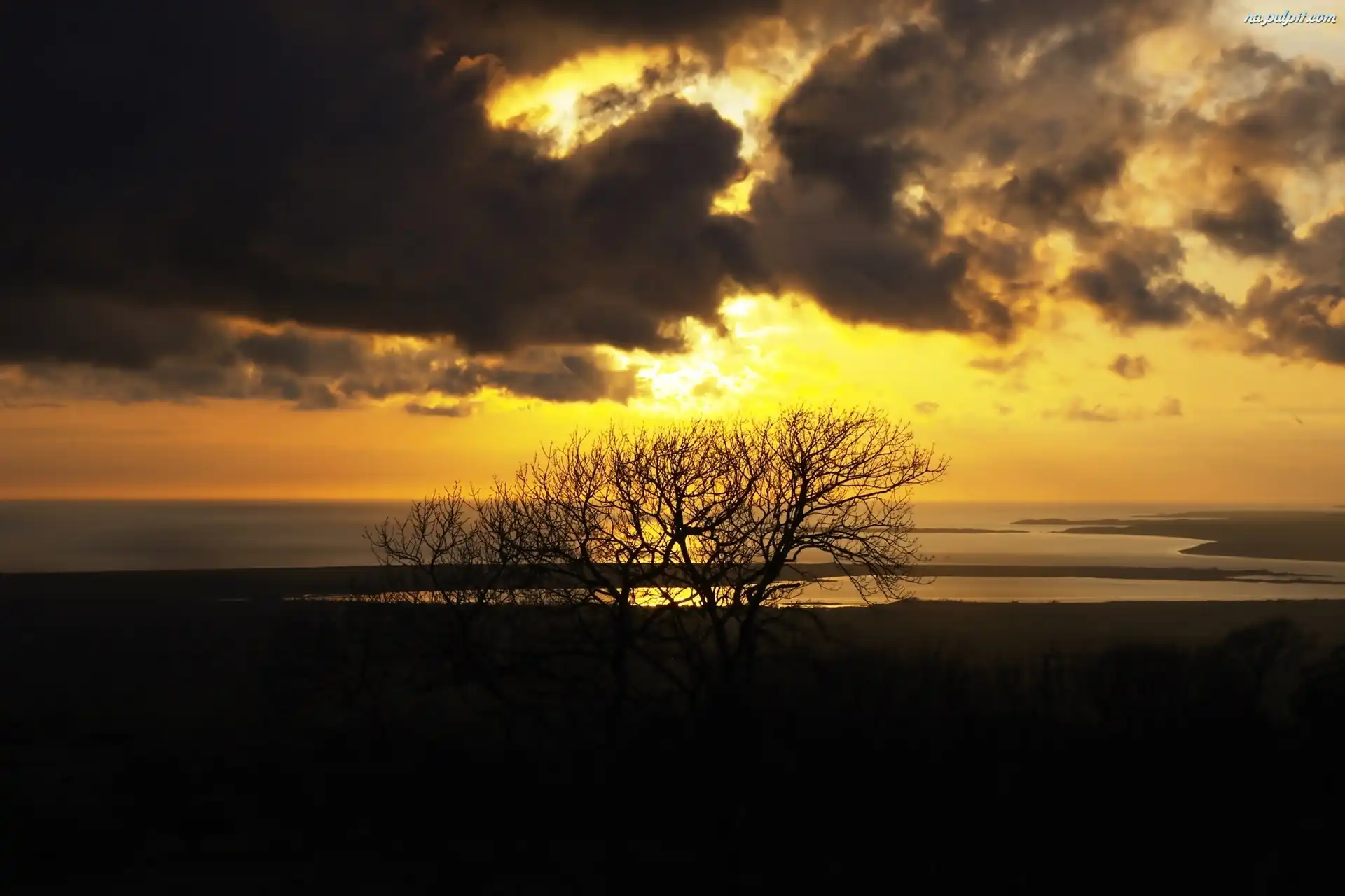 Jezioro, Chmury, Zachód Słońca, Drzewo Na Pulpit