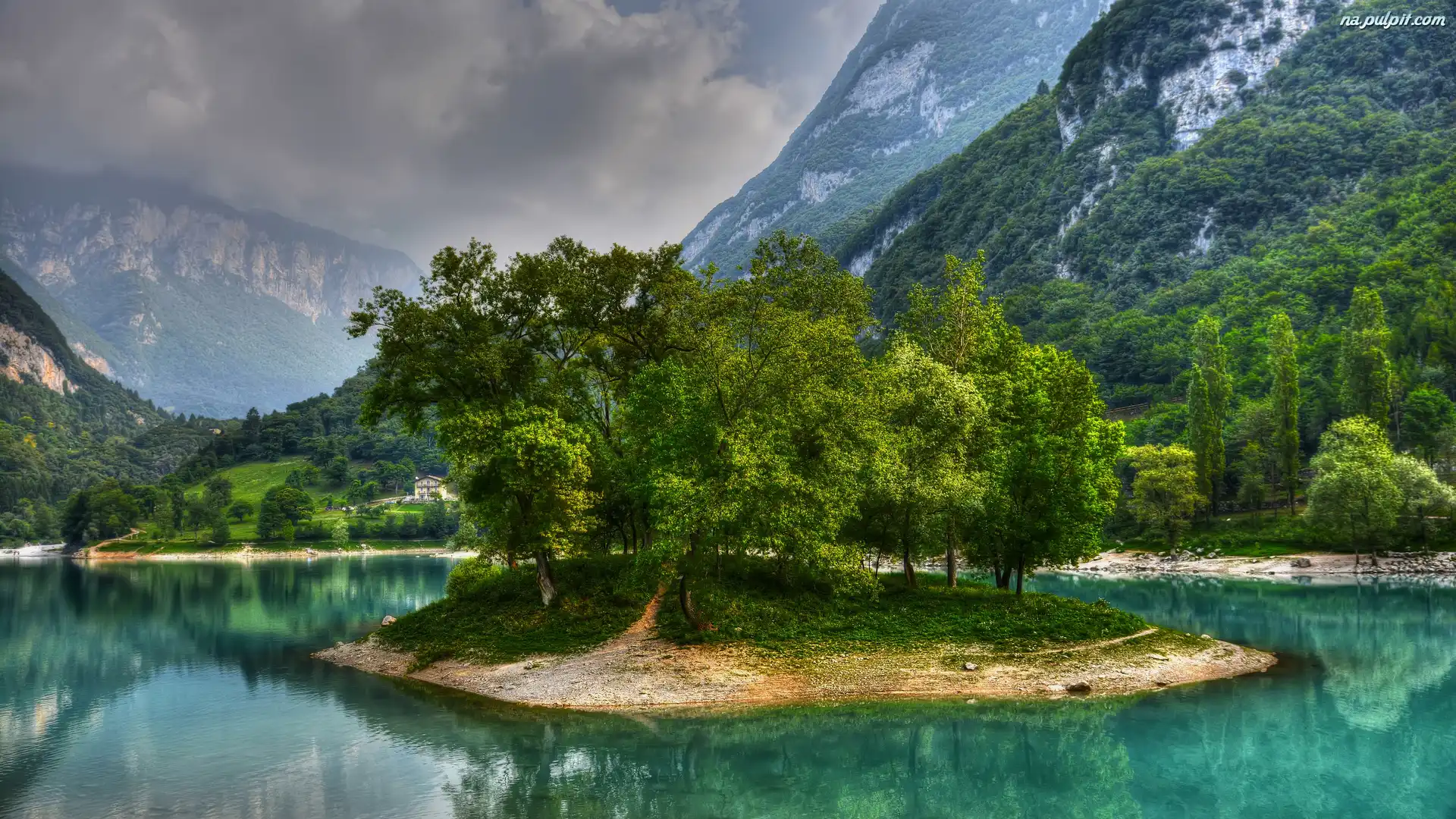 Jezioro, Drzewa, Zielone, Wyspa, Góry
