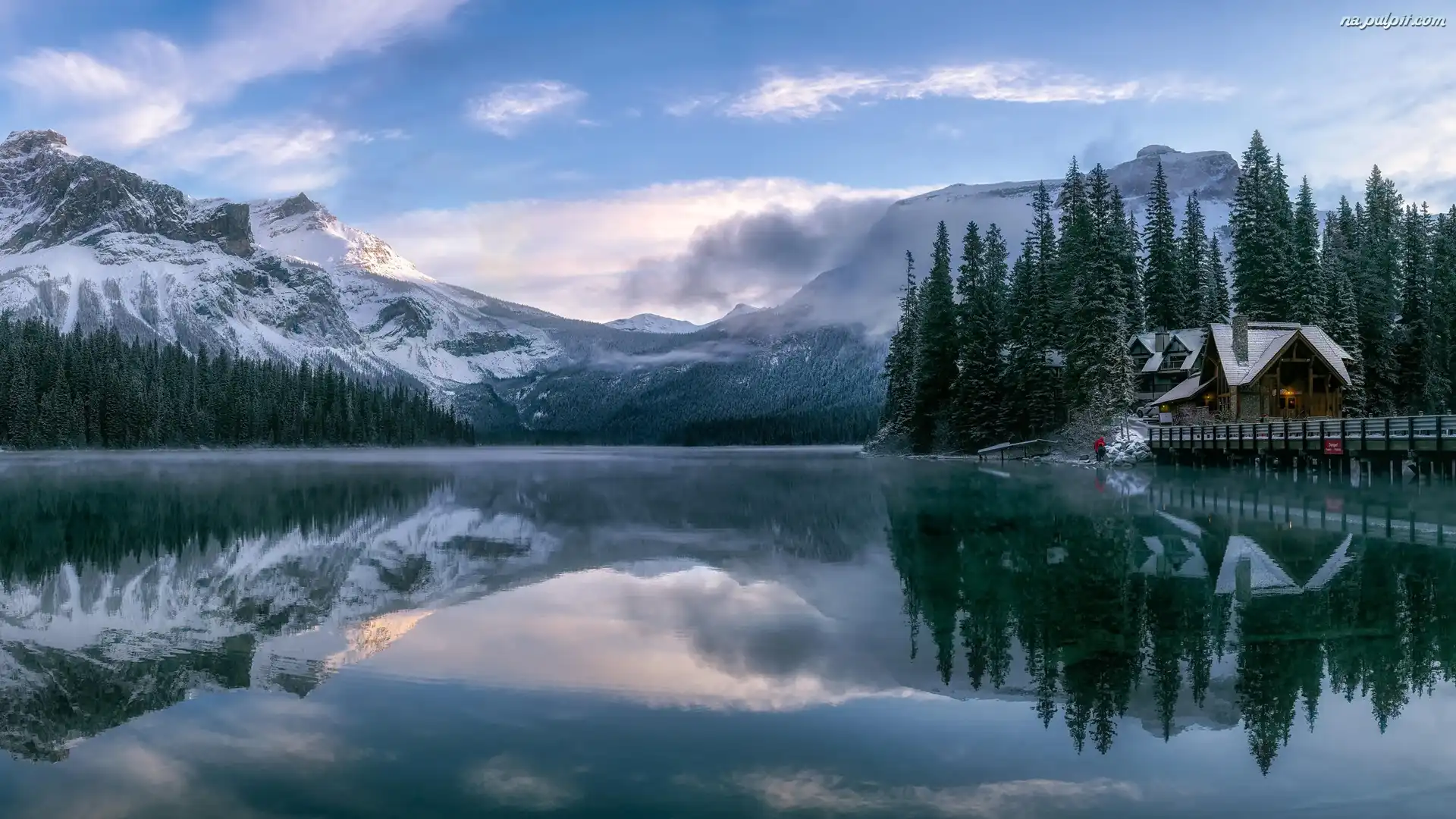 Jezioro, Most, Kanada, Emerald Lake, Dom, Chmury, Prowincja Kolumbia Brytyjska, Drzewa, Góry, Park Narodowy Yoho, Las Na Pulpit |