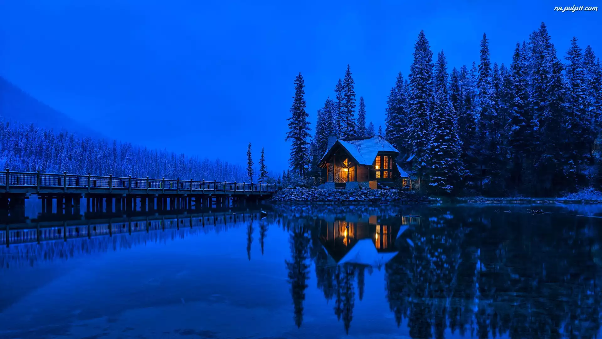 Jezioro, Oświetlony, Kanada, Emerald Lake, Dom, Drzewa, Prowincja Kolumbia Brytyjska, Las, Most, Park Narodowy Yoho, Góry Na Pulpit |