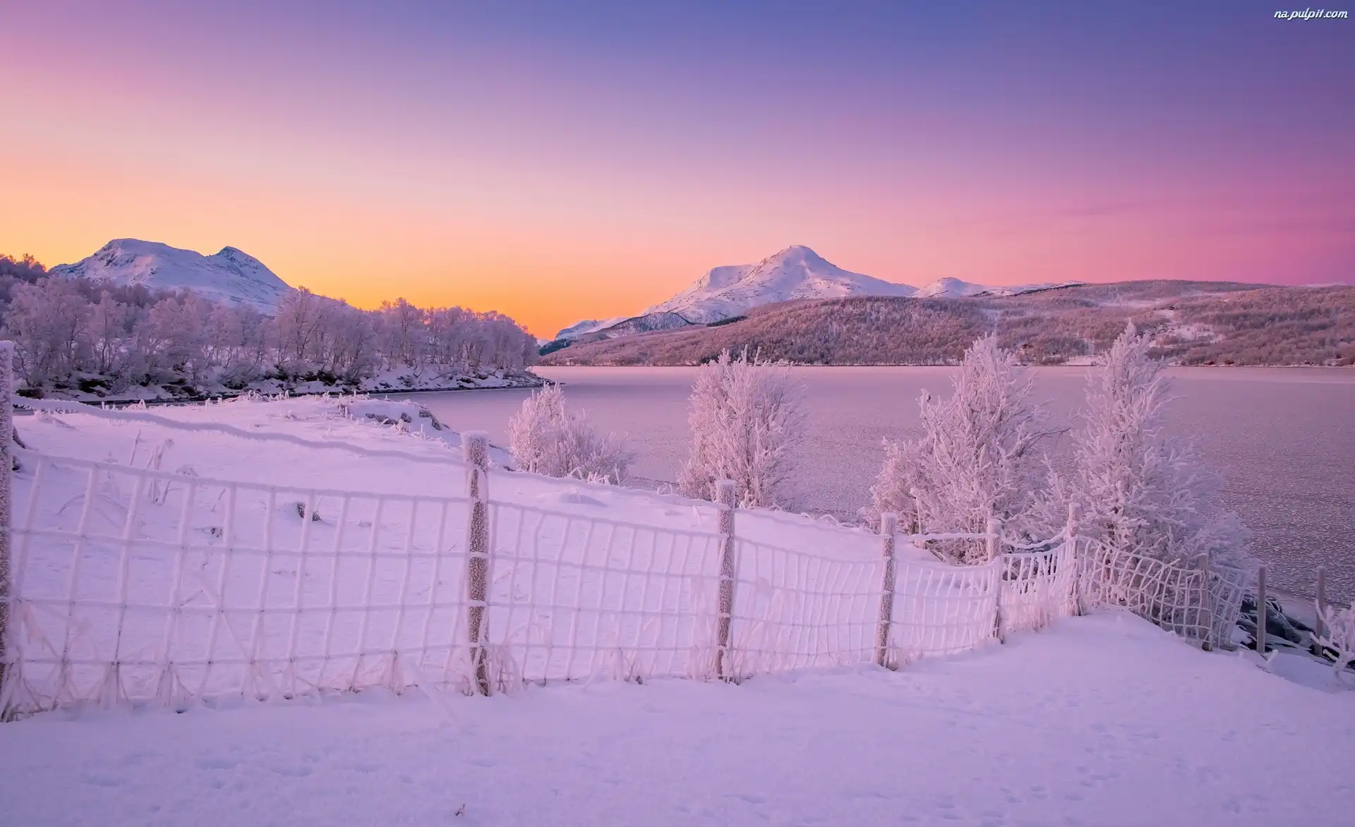 Oszronione, Śnieg, Zachód, Słońca, Drzewa, Ogrodzenie, Góry, Zima, Jezioro