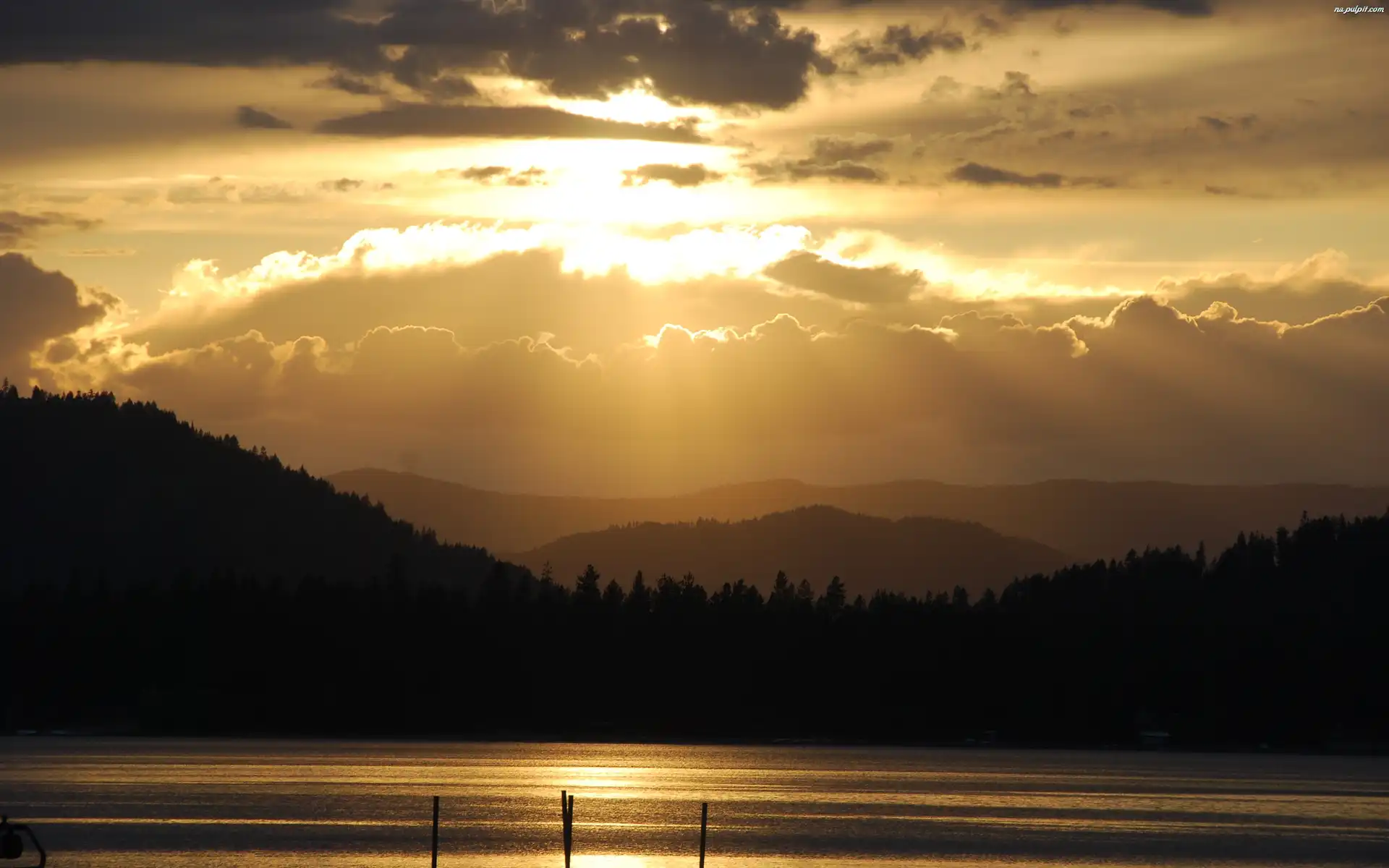 Jezioro, Chmury, Słońca, Zachód, Góry
