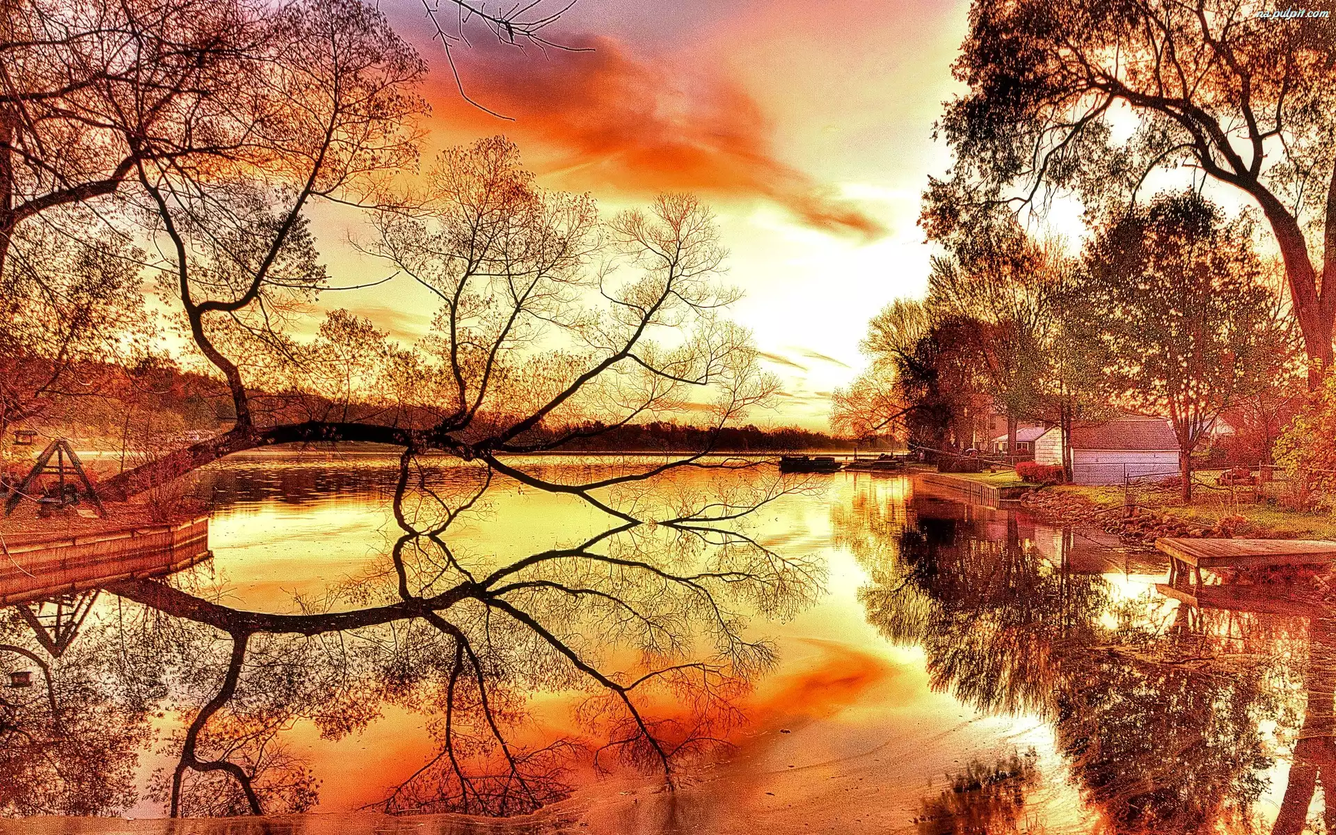 Jezioro, Słońca, Zachód, Drzewa Na Pulpit