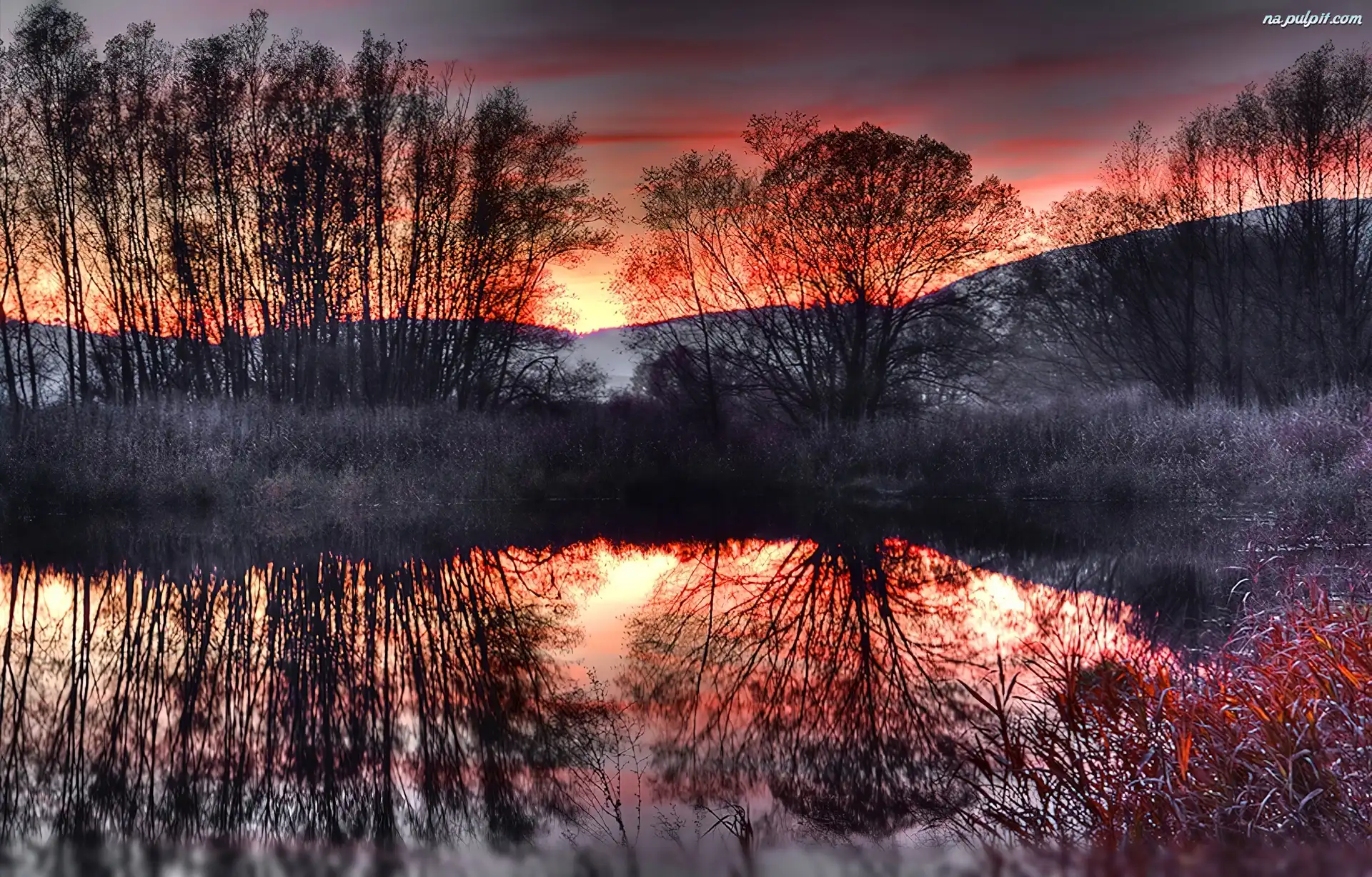Jezioro, Słońca, Zachód, Drzewa