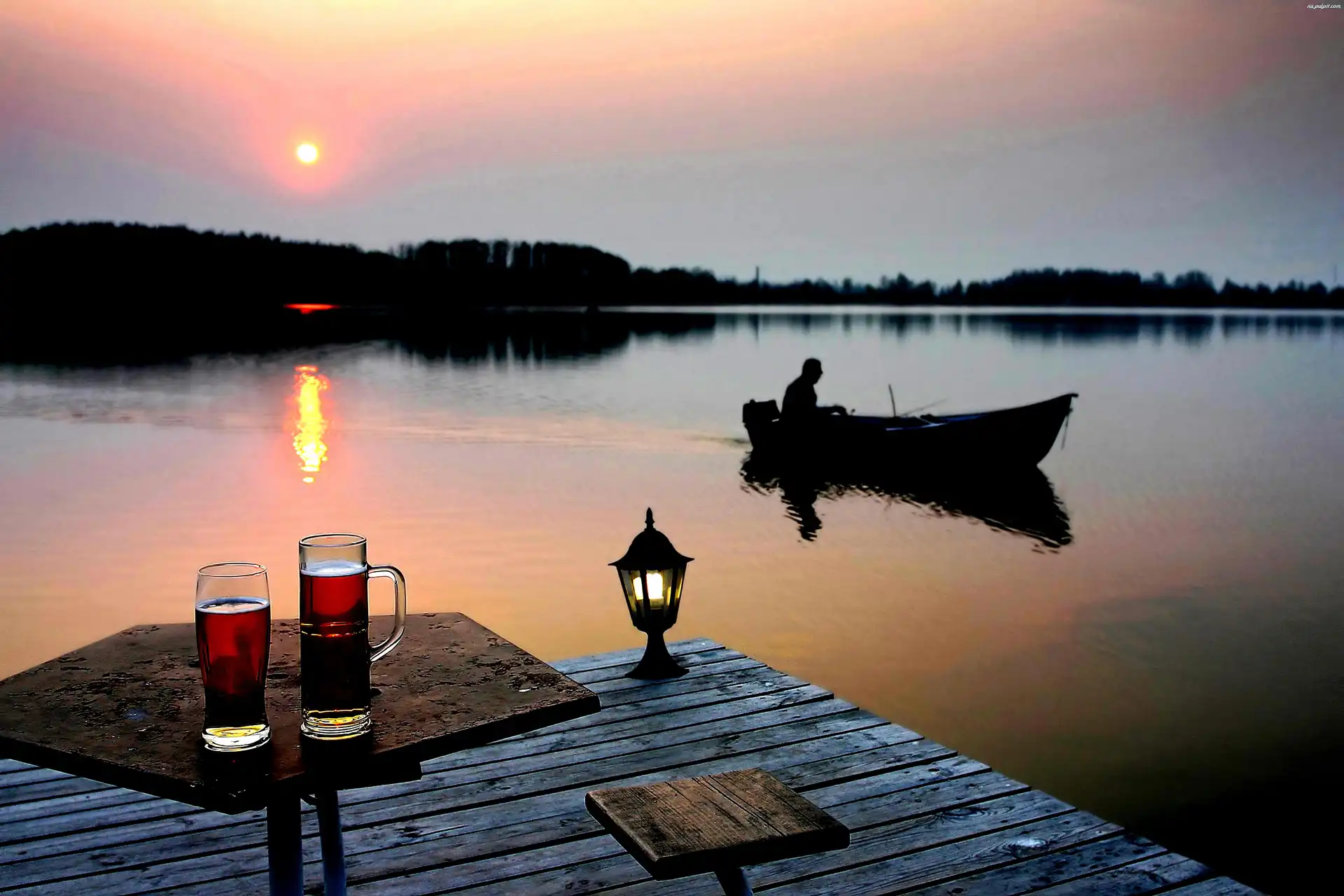 Łódź, Zachód słońca, Jezioro, Rybak Na Pulpit