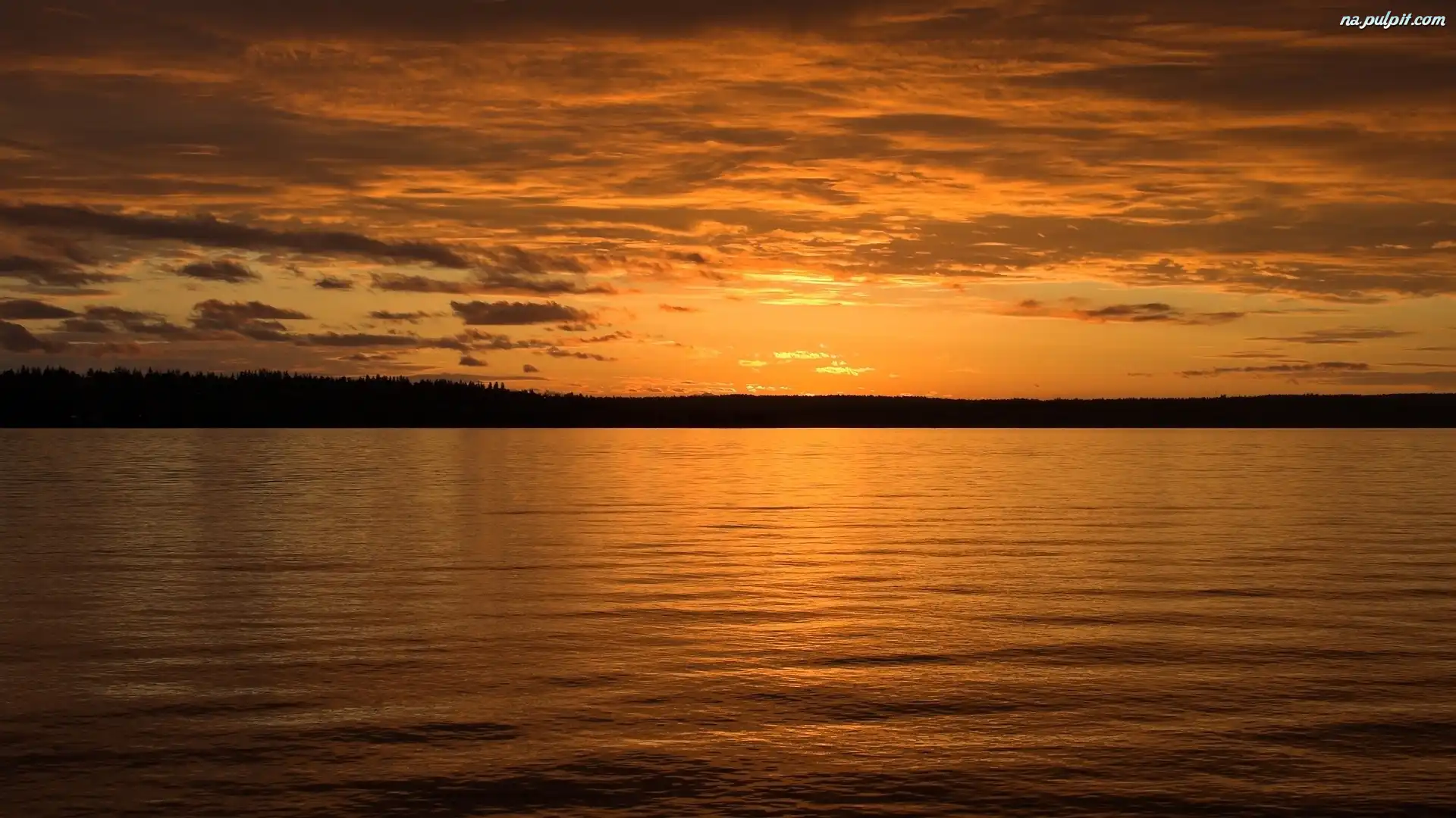 Jezioro, Promienie, Słońca, Zachód, Chmury