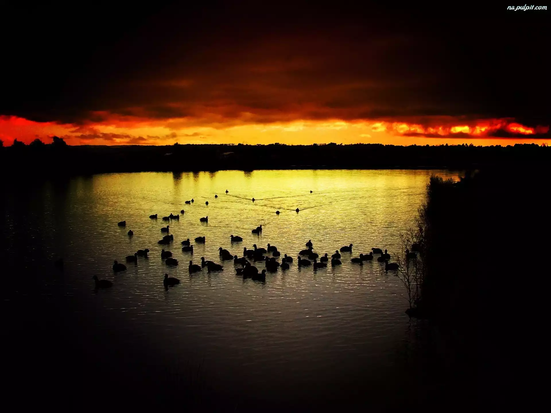 Jezioro, Promienie, Słońca, Zachód, Ptaki Na Pulpit