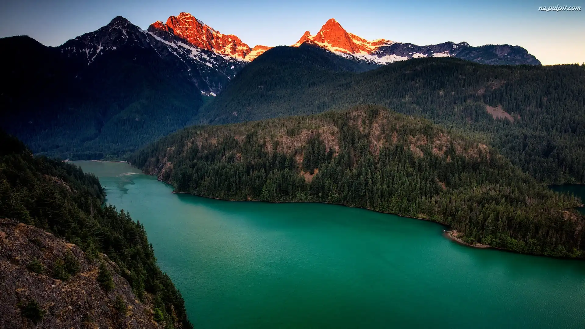 Jezioro, Stan Waszyngton, Park Narodowy Północnych Gór Kaskadowych, Góry, Diablo Lake, Las, Rozświetlone, Stany Zjednoczone, Szczyty Na Pulpit |