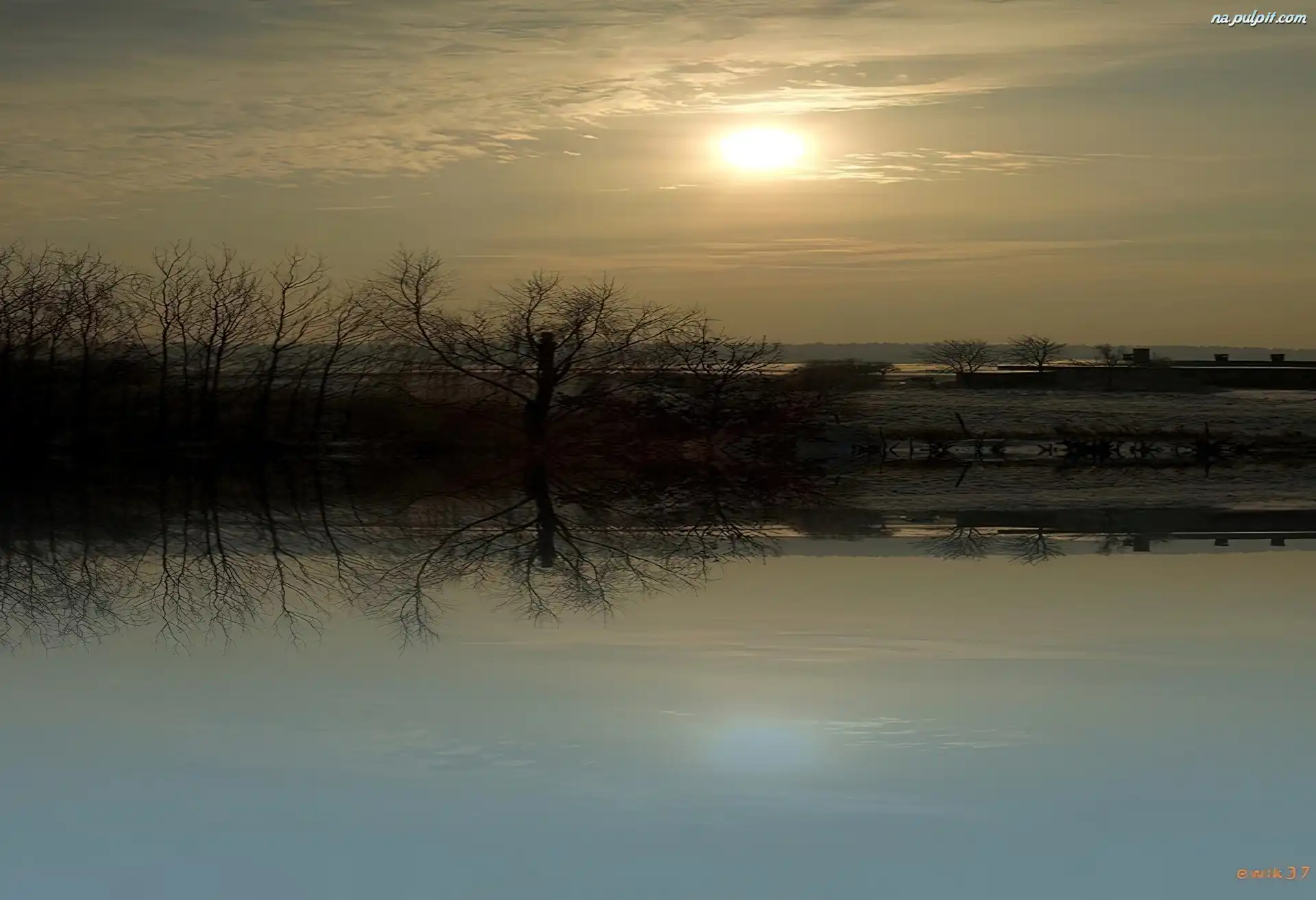 Jeziorze, Odbicie, Drzewa, Słońce, W