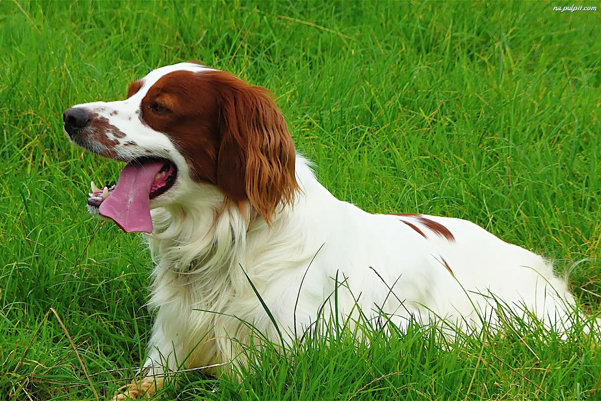 trawa, język, Seter irlandzki czerwono-biały, młoda Na Pulpit