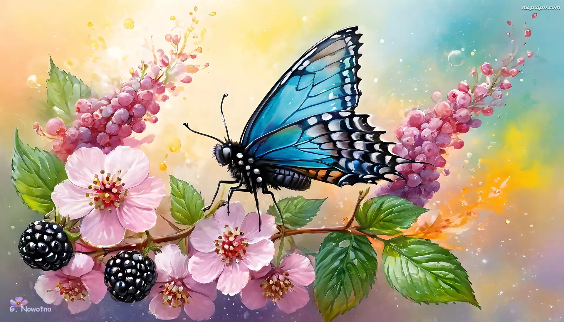 Grafika, Niebieski, Liście, Jeżyny, Różowe, Kwiaty, Motyl Na Pulpit