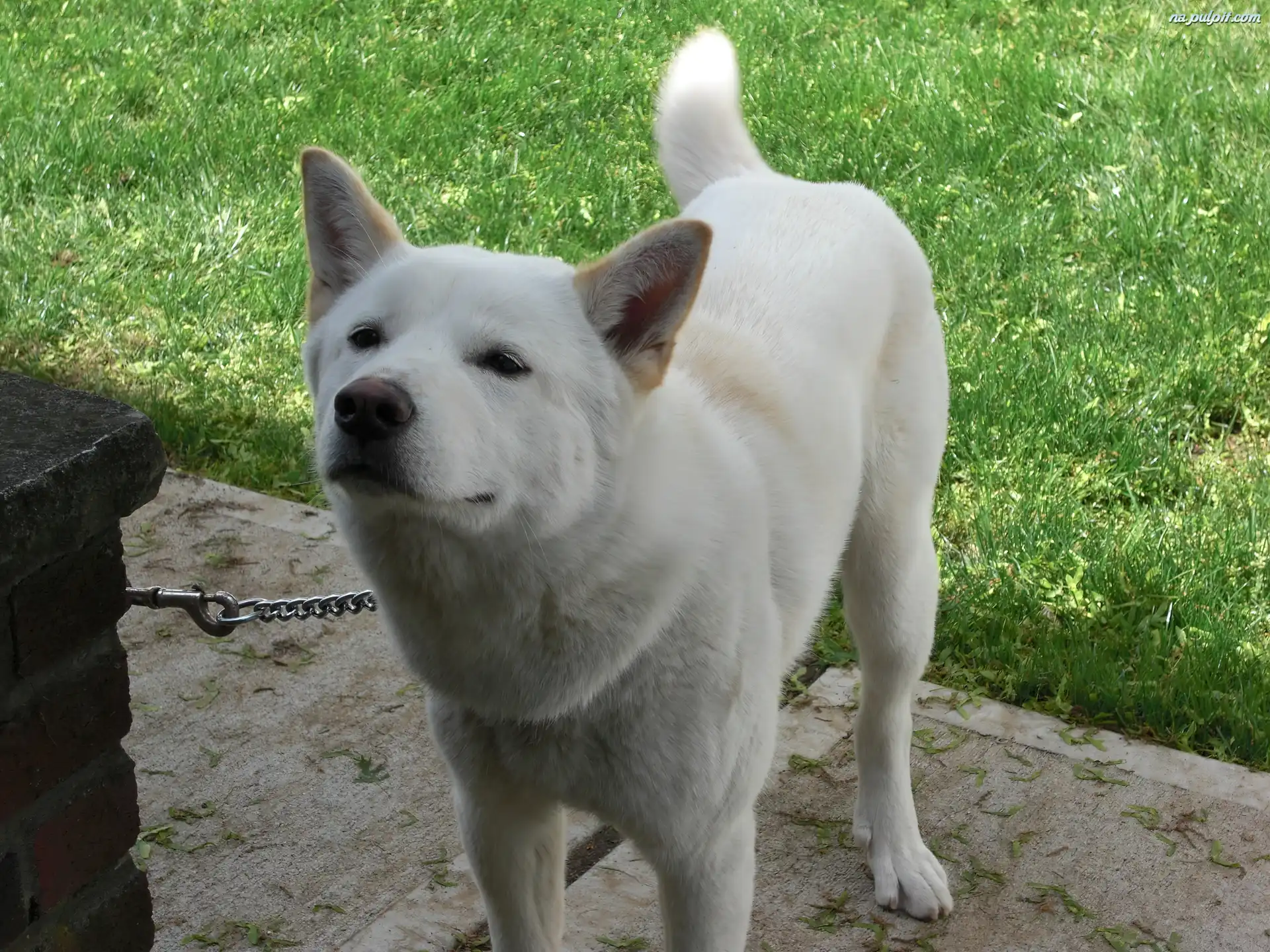 niebo, Jindo, niebieskie Kamyczki, Piesek, Jindo Jindo, skały głowa, Jindo biały, Jindo Jindo, łańcuch Jindo, Kapelusz, Pies, Skałki Jindo, język, pysk, kły