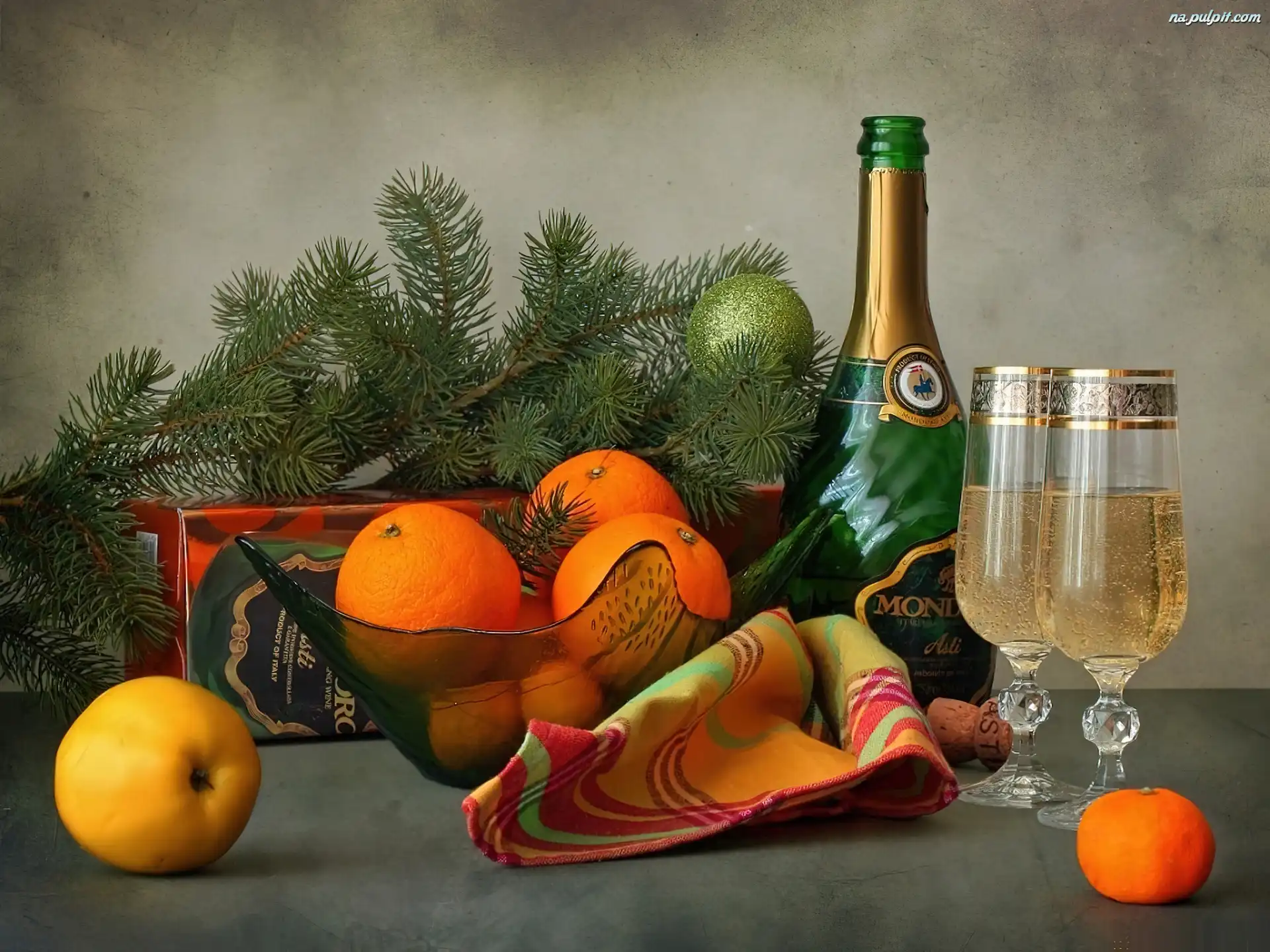 Jodły, Owoce, Cytrusowe, Wino, Gałązka, Kieliszki Na Pulpit