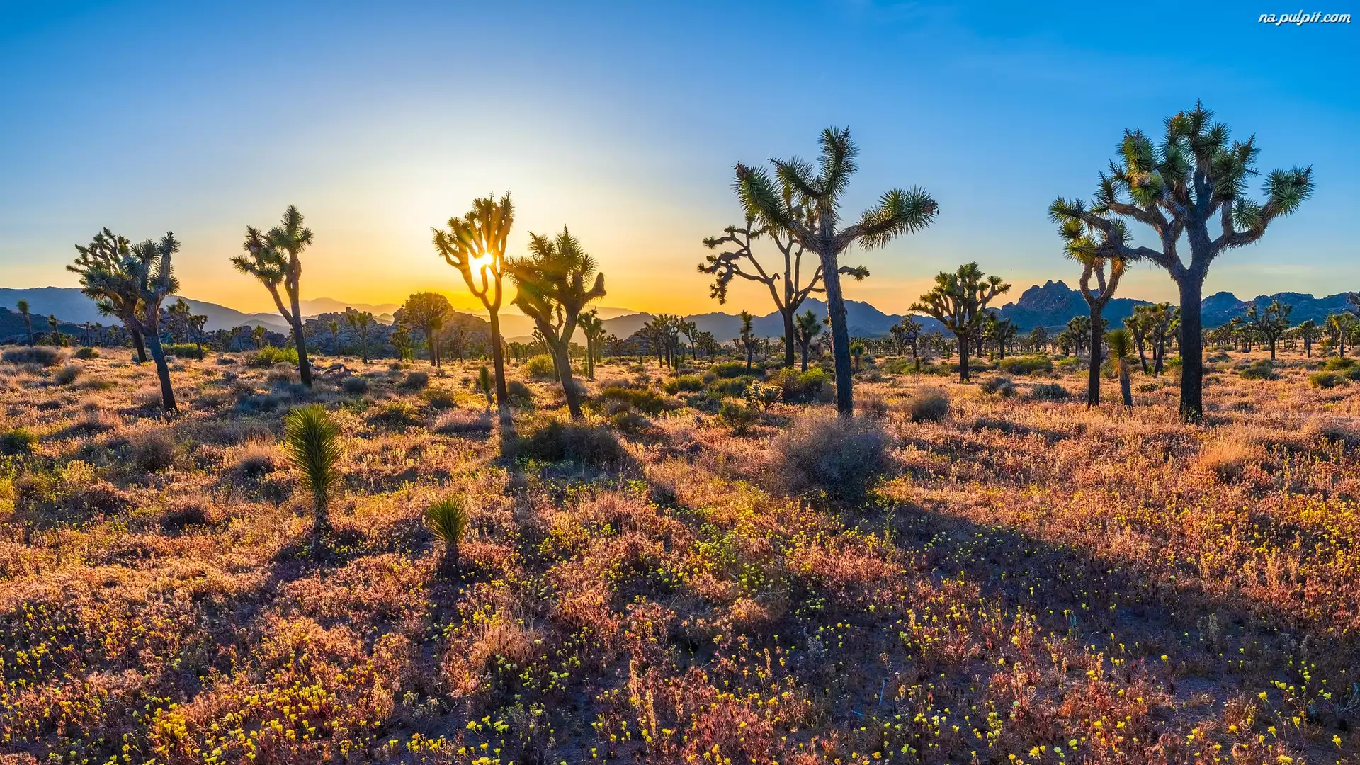 Kalifornia, Wschód słońca, Kwiaty, Park Narodowy Joshua Tree, Drzewa Jozuego, Stany Zjednoczone Na Pulpit |