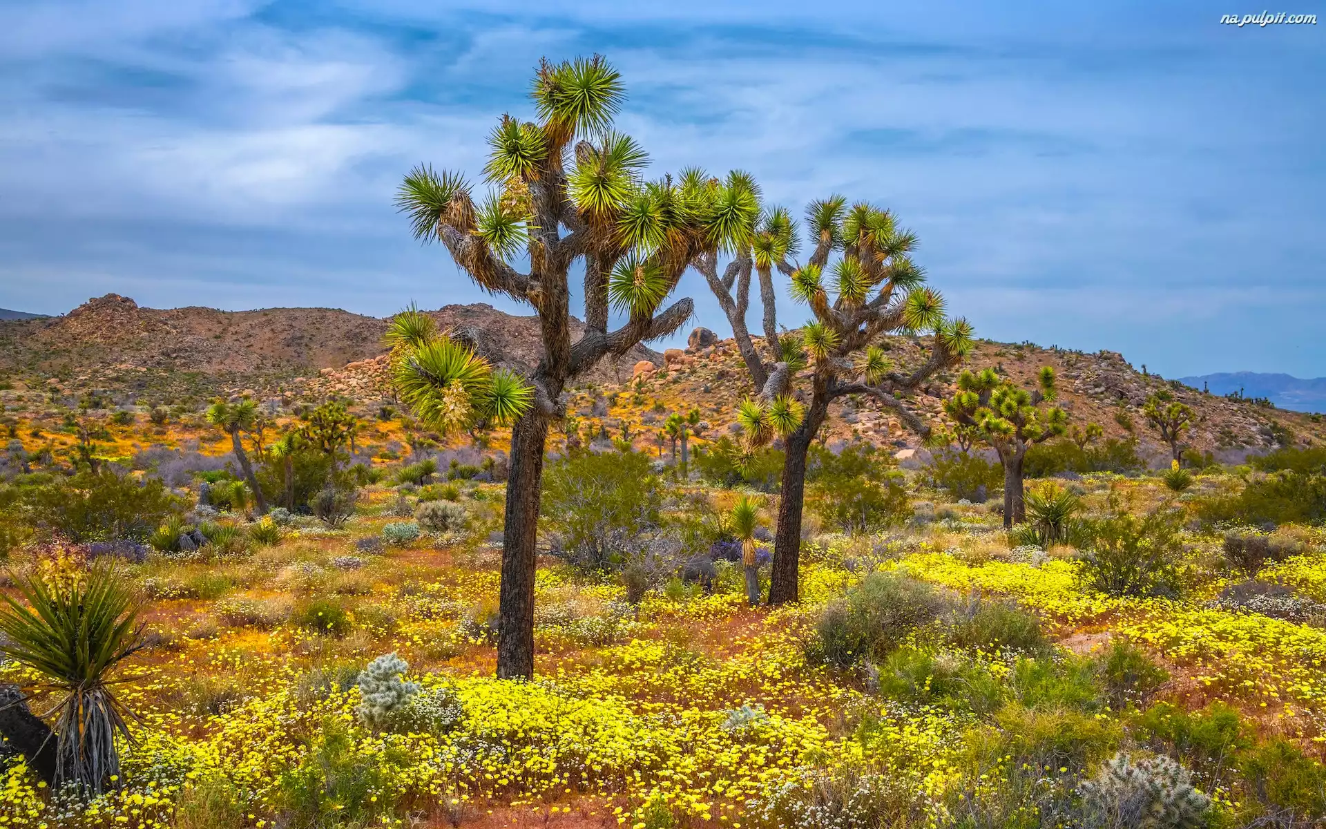 Wzgórza, Drzewo Jozuego, Jukki krótkolistne, Stany Zjednoczone, Kalifornia, Park Narodowy Joshua Tree, Roślinność Na Pulpit |