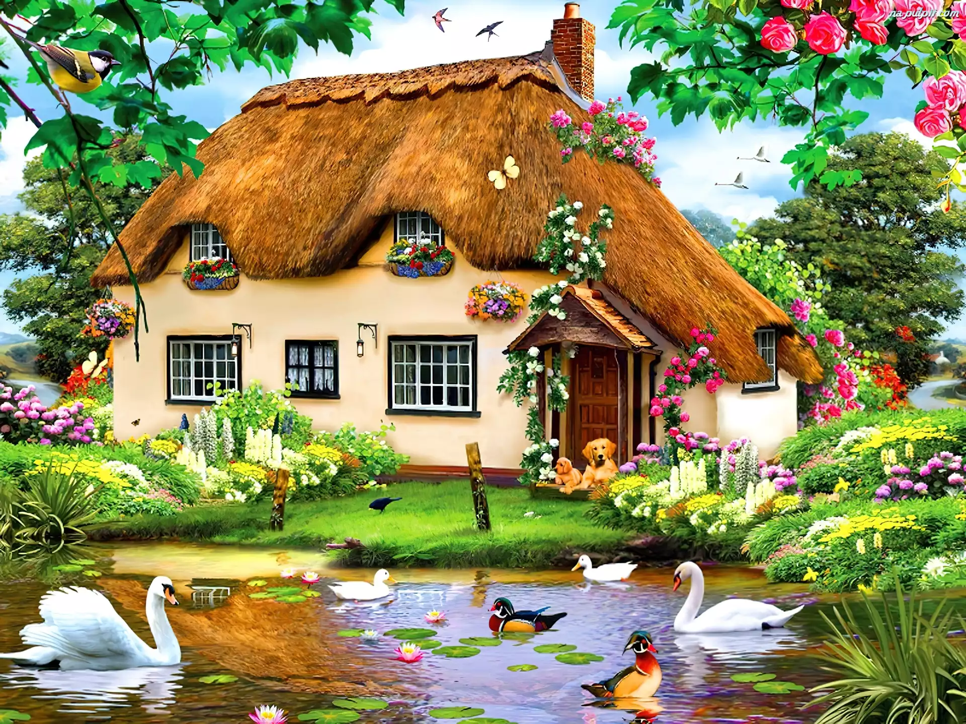 Kaczki, Ogród, Dom, Łabędzie Na Pulpit