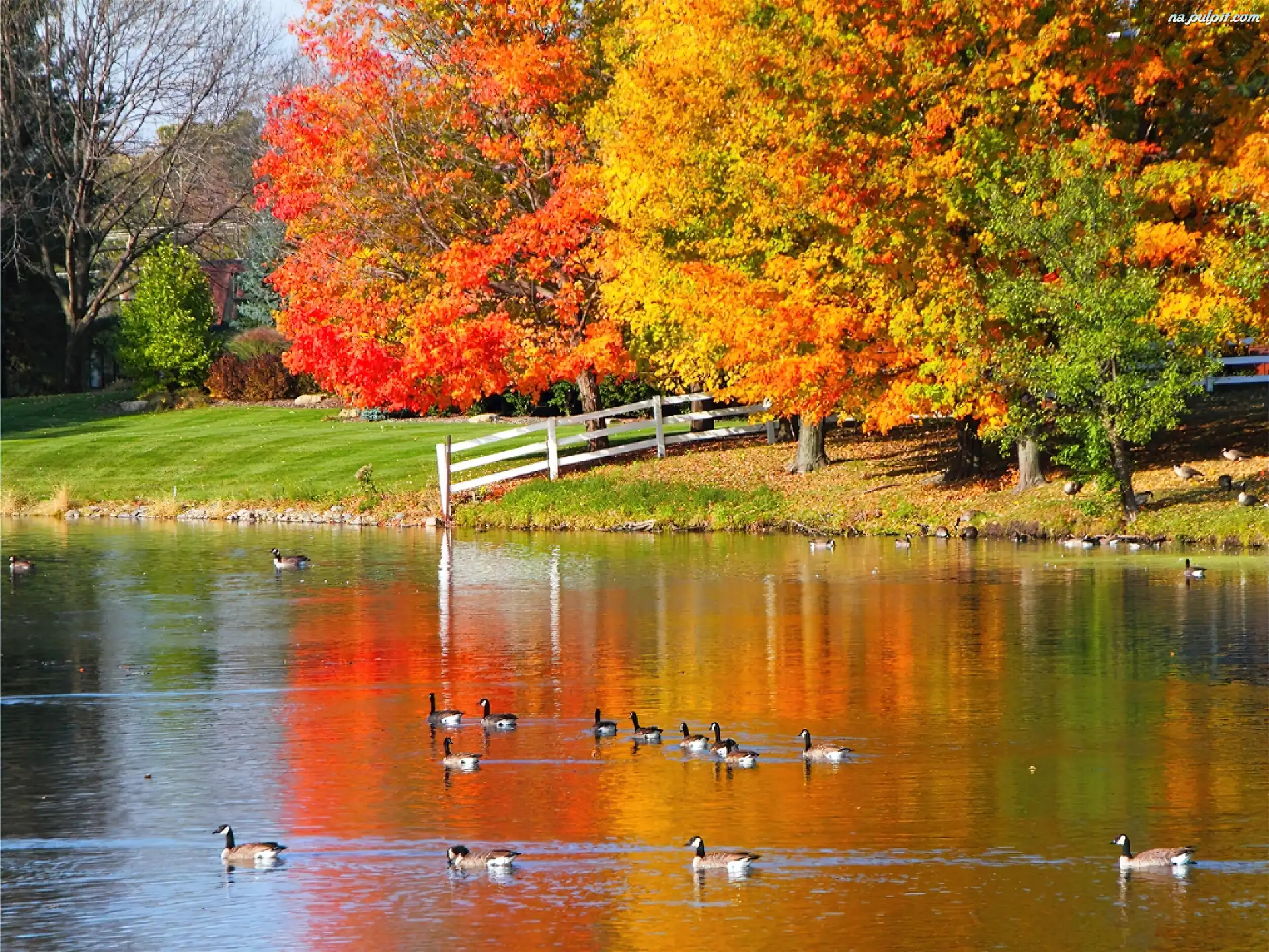 Kaczki, Trawa, Drzewa, Woda Na Pulpit