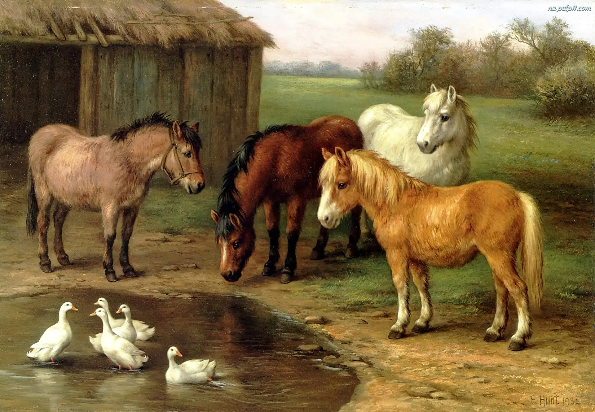 Kaczki, Konie, Edgar Hunt, Staw Na Pulpit