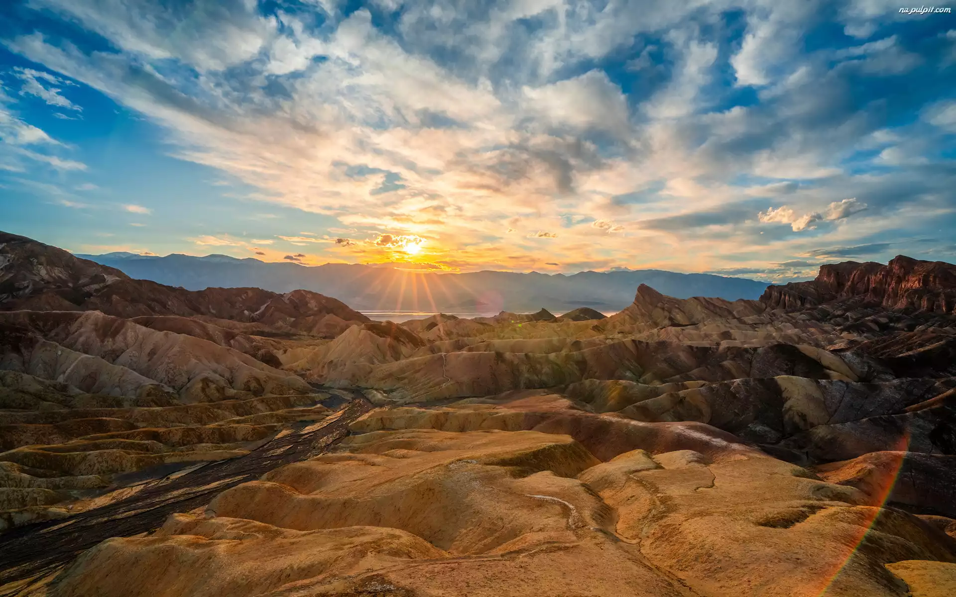 Park Narodowy Death Valley, Zachód słońca, Skały, Stany Zjednoczone, Kalifornia, Góry, Promienie Na Pulpit |