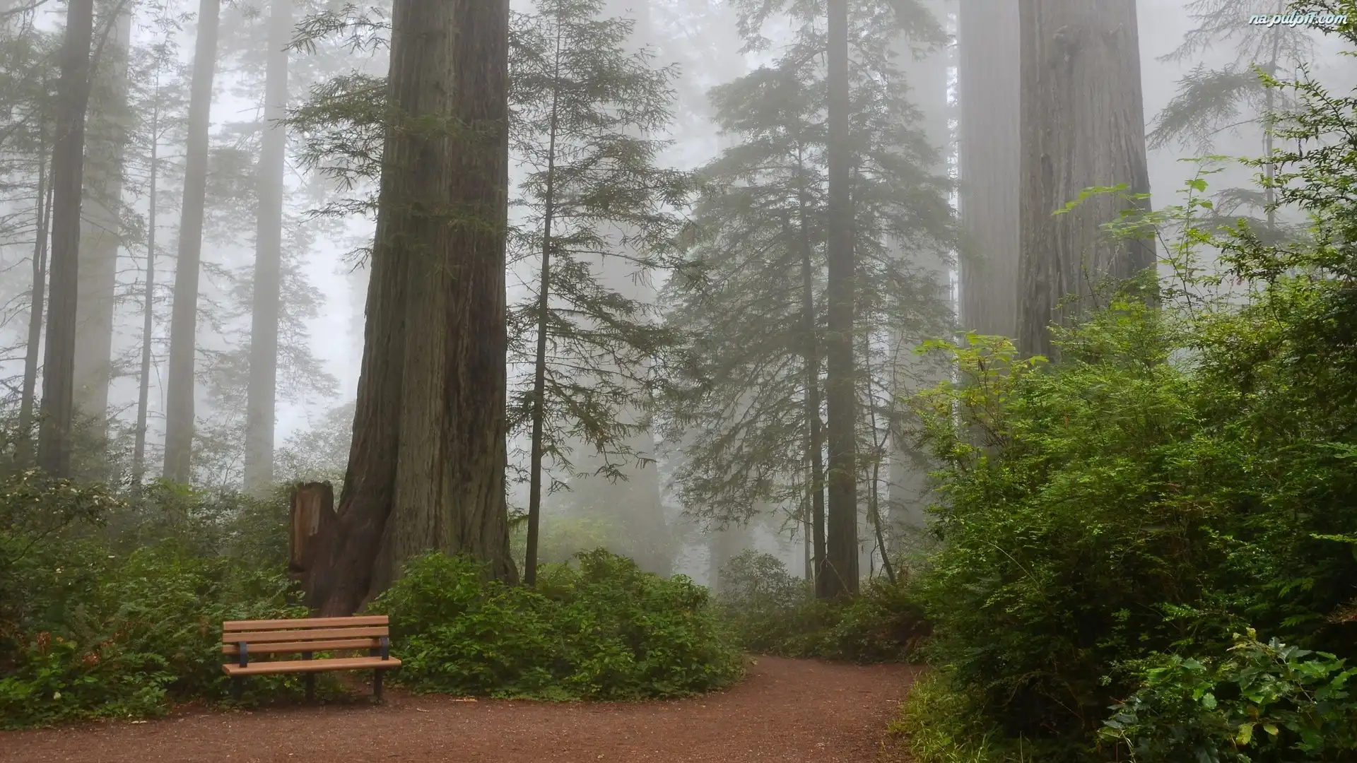 Ławka, Stan Kalifornia, Park Narodowy Redwood, Drzewa, Sekwoje, Mgła, Stany Zjednoczone, Droga Na Pulpit |