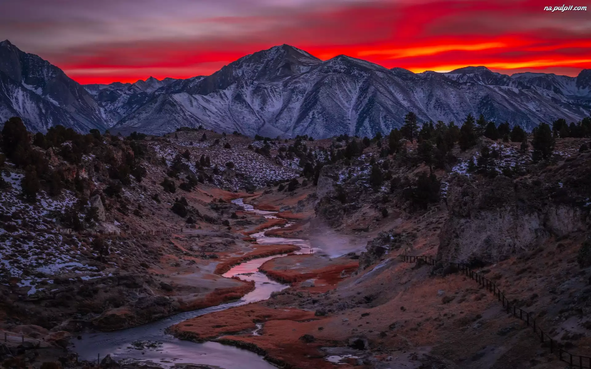 Kalifornia, Rzeka, Góry, Miejscowość Mammoth Lakes, Lasy państwowe, Inyo National Forest, Zachód słońca, Dolina, Stany Zjednoczone, Hot Creek Na Pulpit |