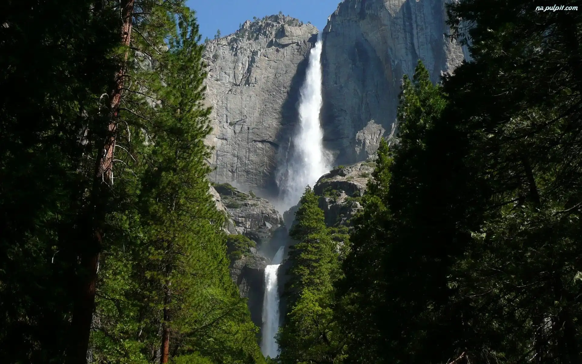Drzewa, Stan Kalifornia, Skały, Wodospad, Park Narodowy Yosemite, Stany Zjednoczone, Góry Na Pulpit