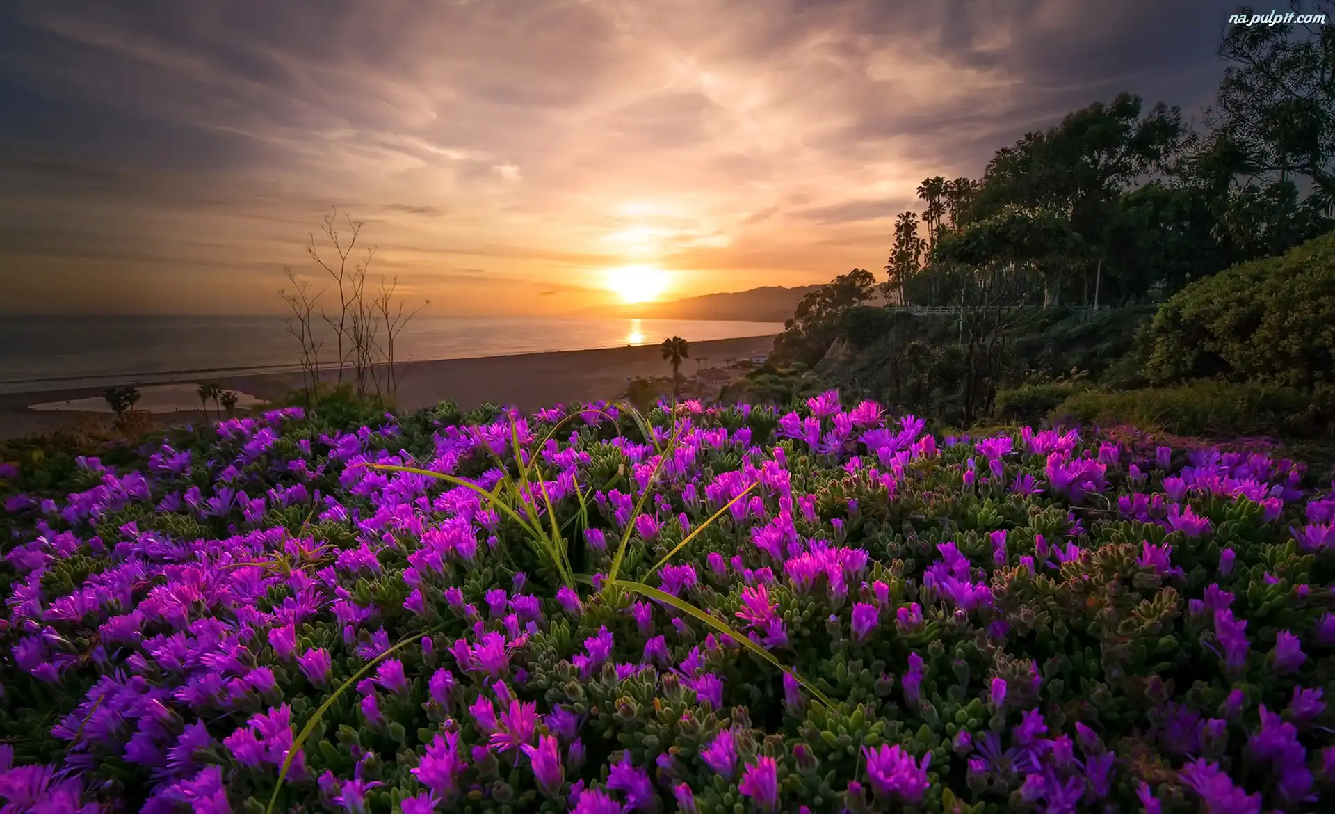 Kwiaty, Stan Kalifornia, Wybrzeże, Zachód słońca, Malibu, Stany Zjednoczone, Ocean Spokojny Na Pulpit |