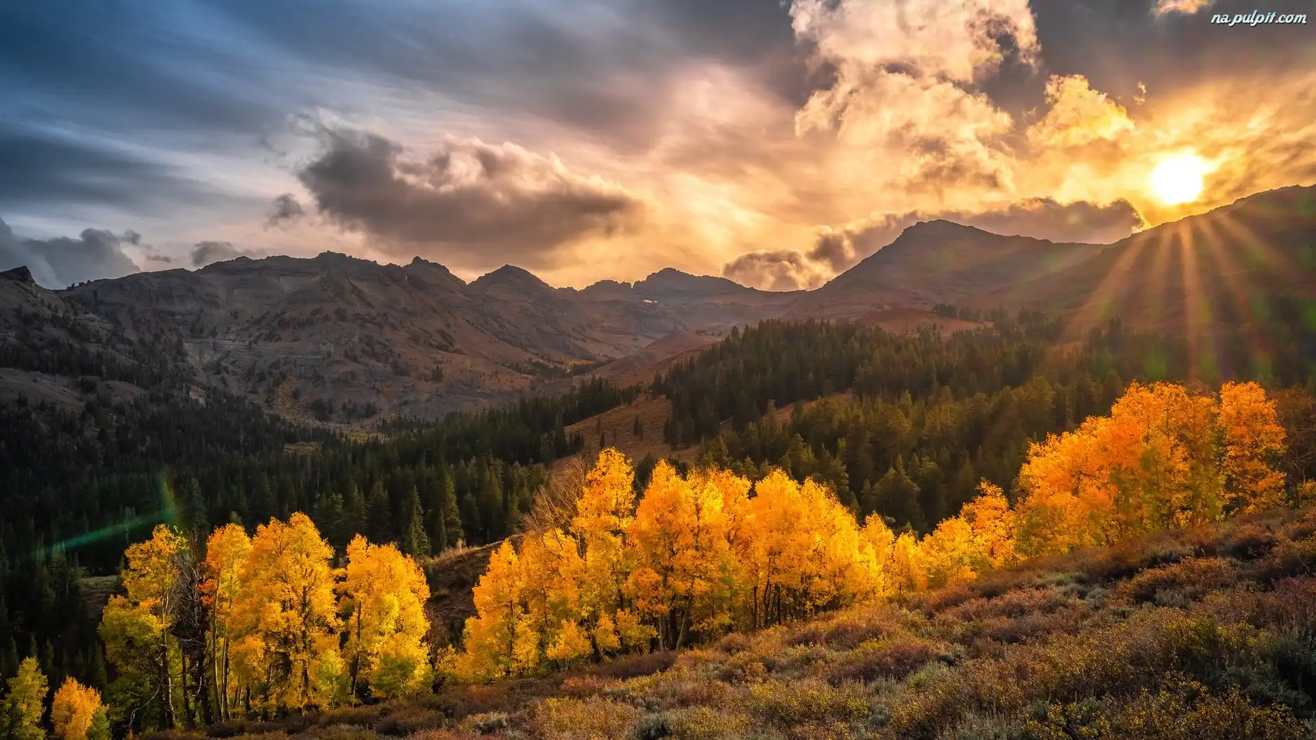 Kalifornia, Góry, Sonora Pass, Region Eastern Sierra, Drzewa, Słońce, Promienie słońca, Jesień, Stany Zjednoczone, Chmury Na Pulpit |