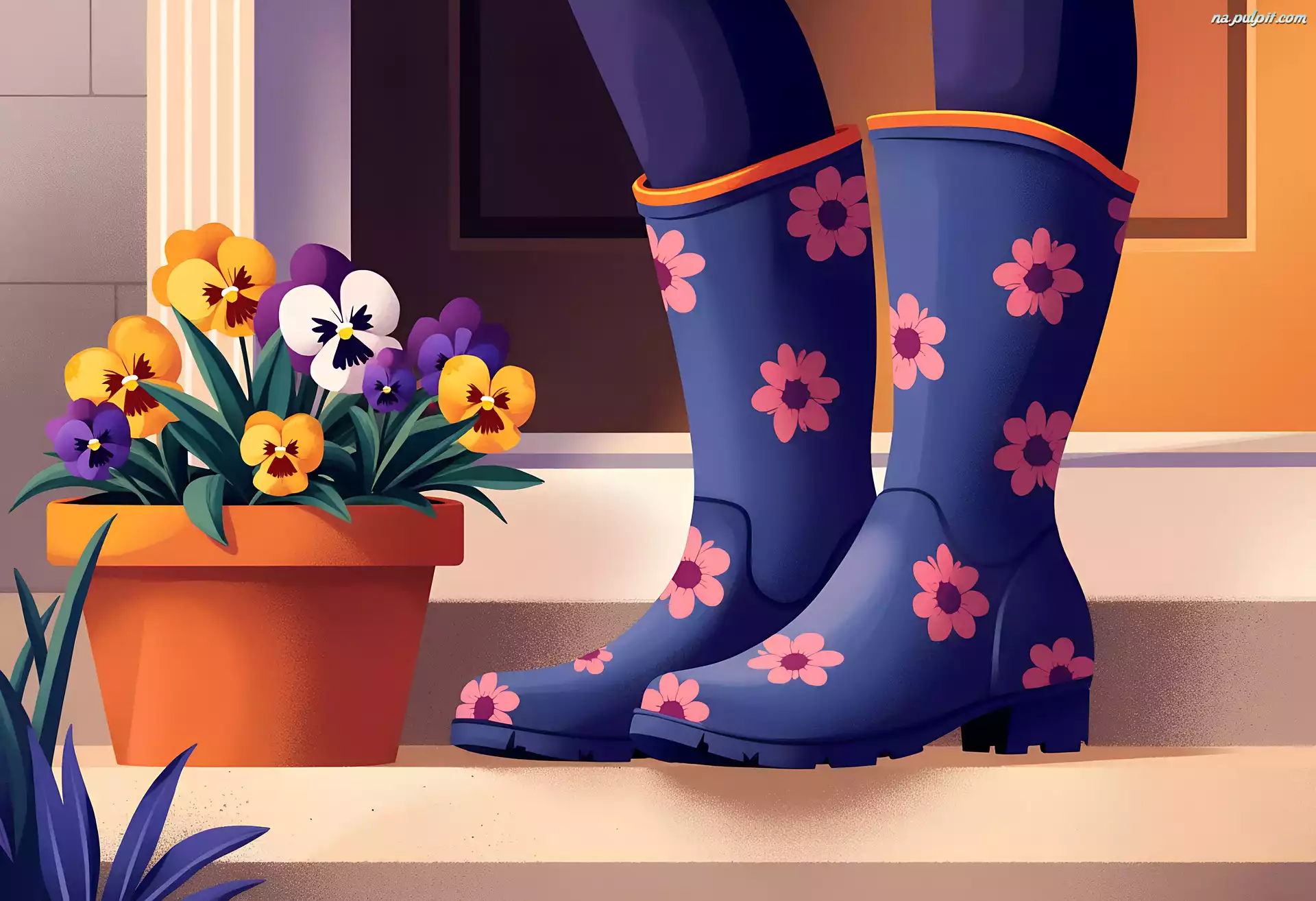 Schody, Doniczka, Granatowe, Kalosze, Bratki, 2D Na Pulpit