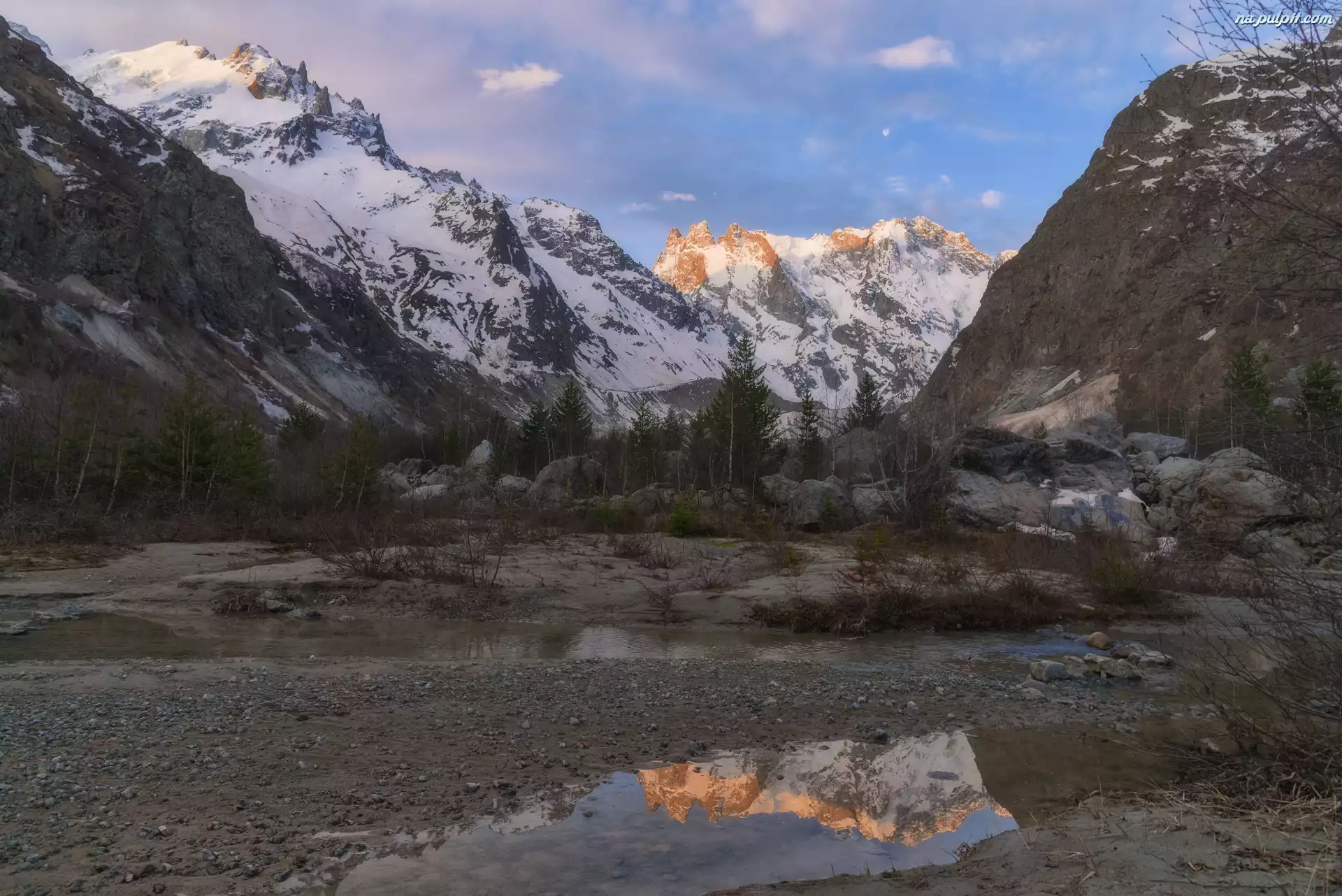 Kałuże, Drzewa, Góry, Ośnieżone, Kamienie