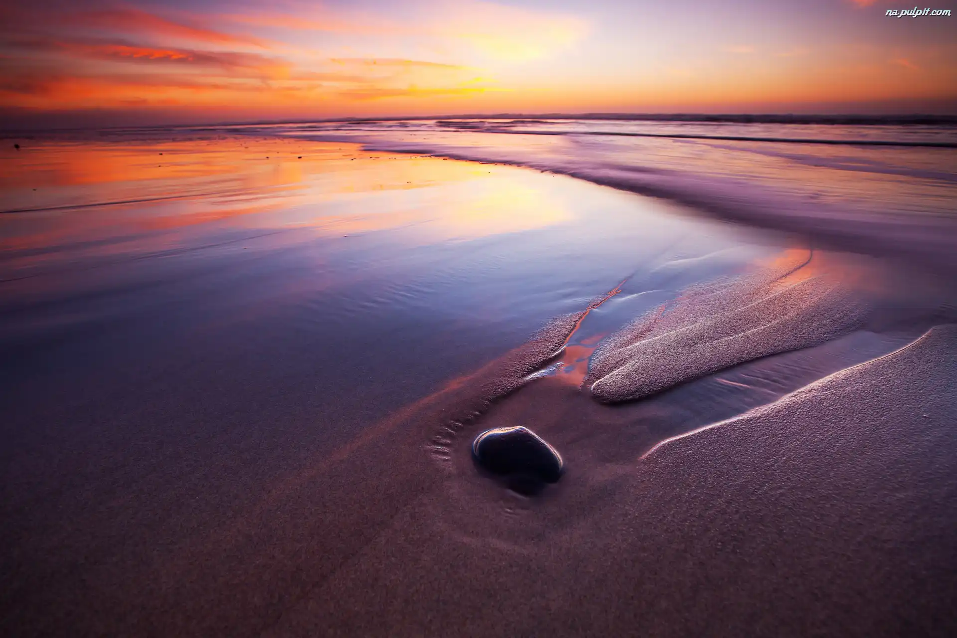 Kamień, Morze, Plaża, Zachód słońca Na Pulpit