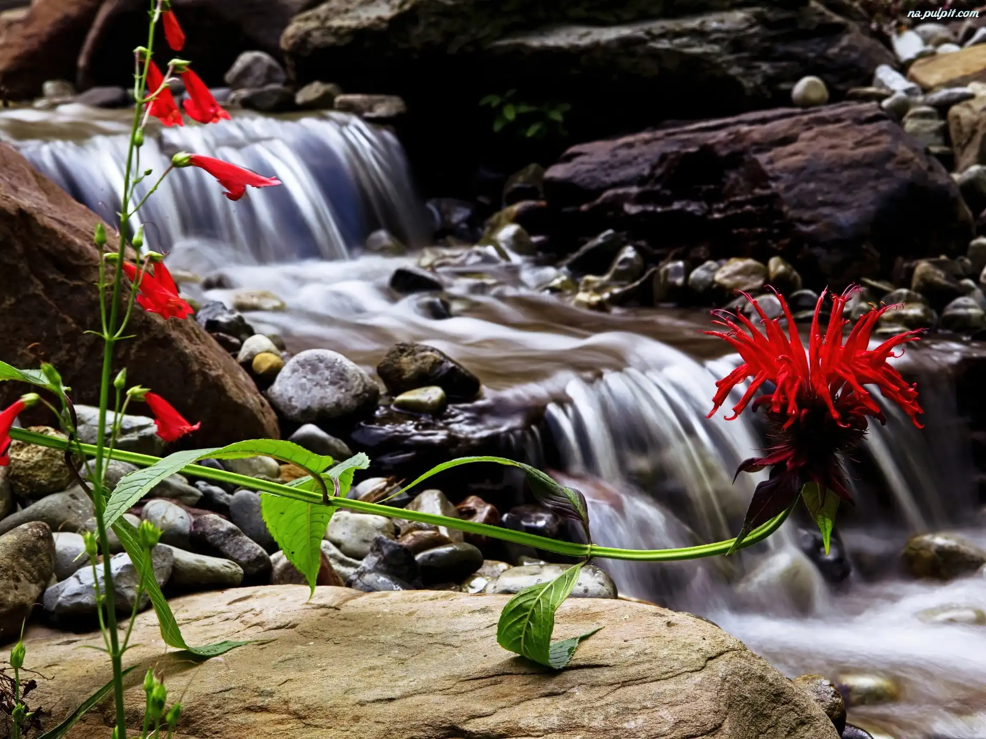 Wodospad, Czerwony, Kwiat, Kamieni, Potok Na Pulpit