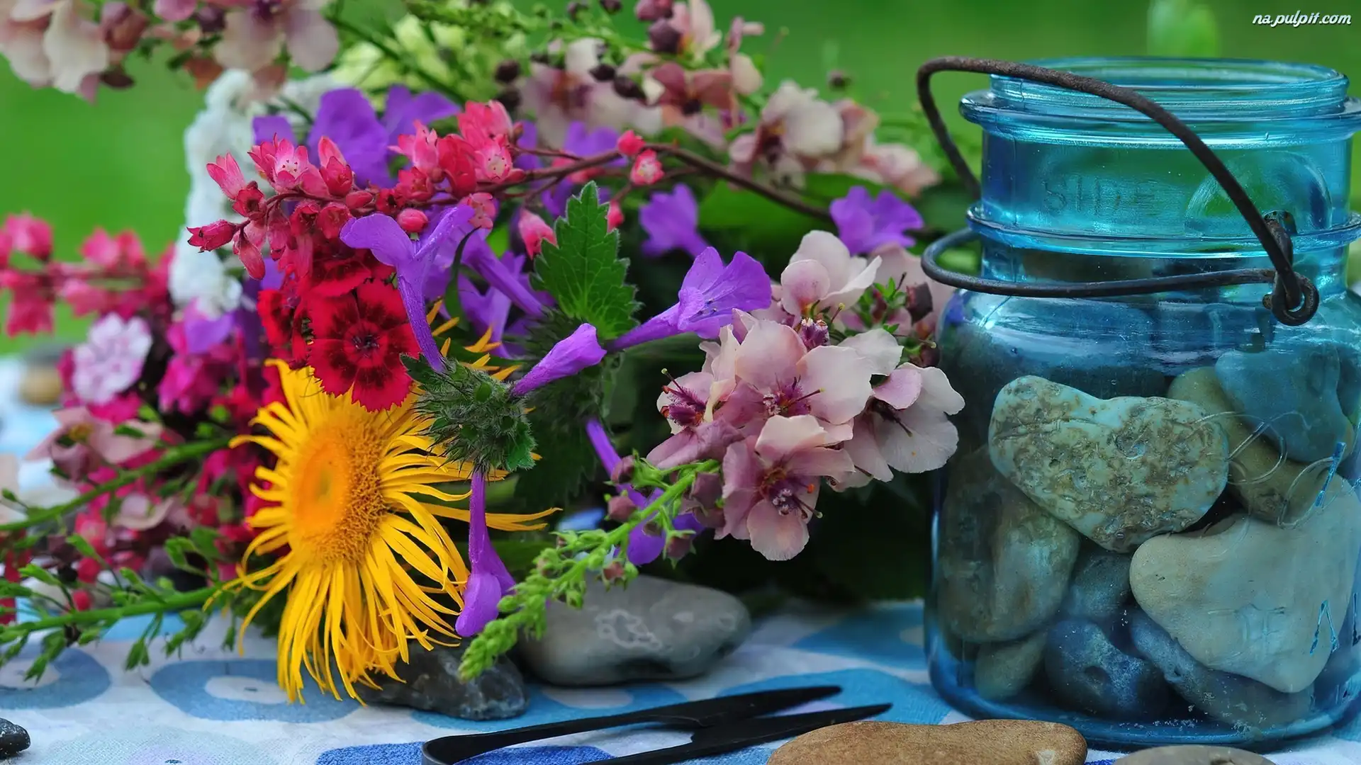 Kamienie, Kwiaty, Bukiet, Słoik Na Pulpit