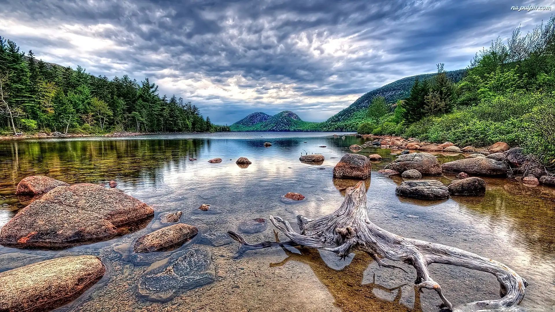 Kamienie, Drzewa, Jezioro, Góry, Chmury Na Pulpit