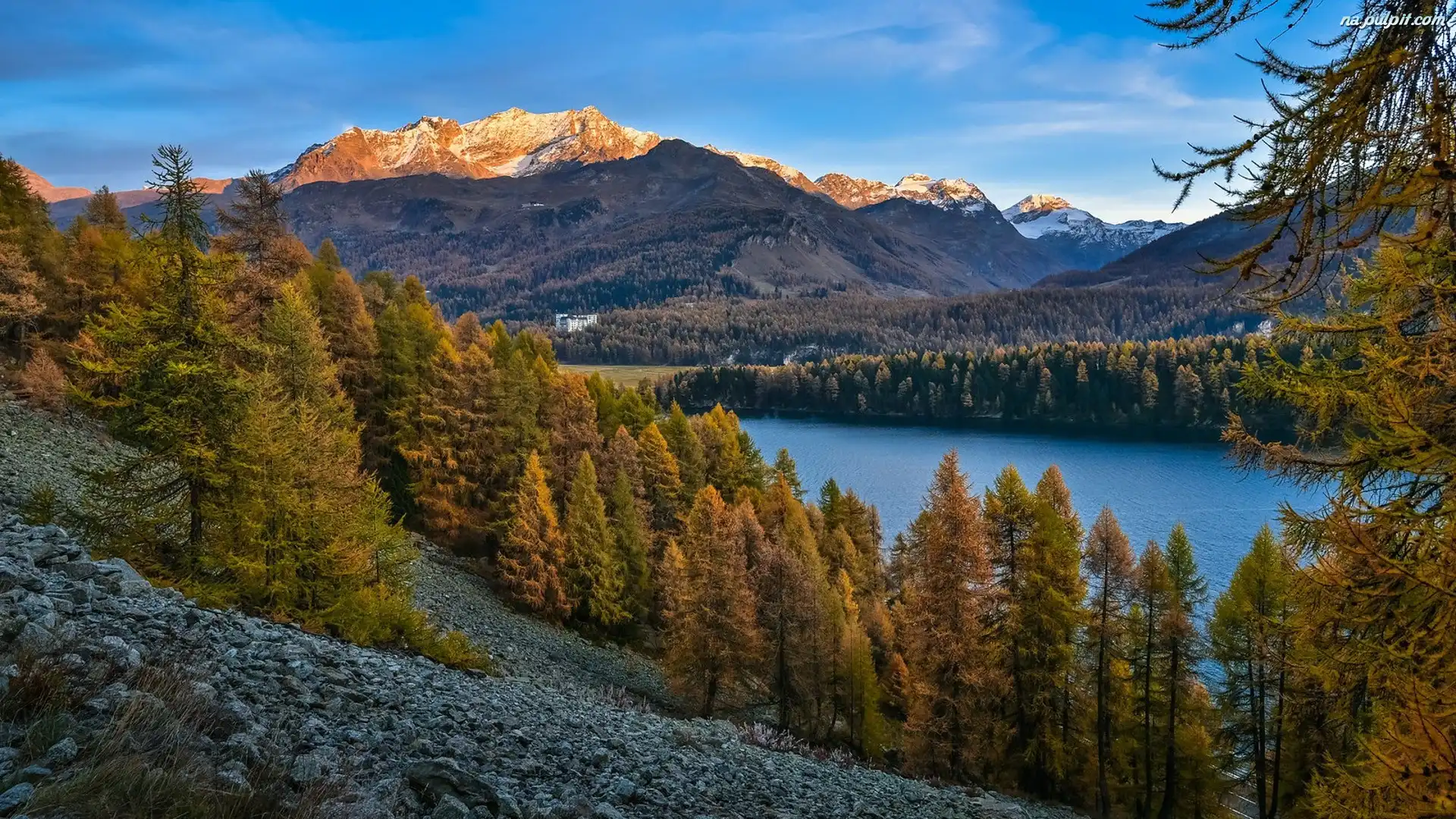 Kamienie, Drzewa, Jezioro, Góry, Zbocze Na Pulpit