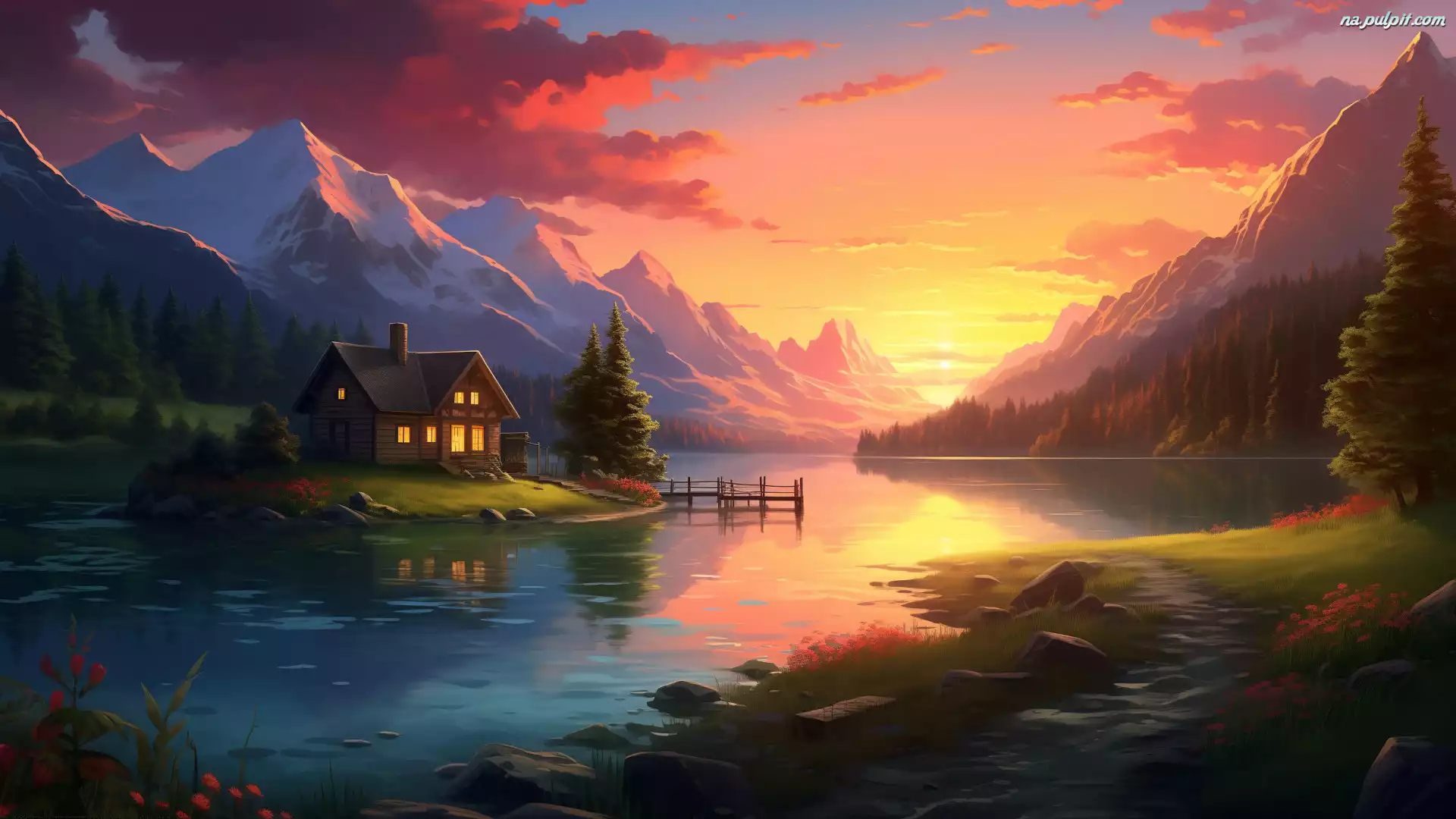 Zachód słońca, Jezioro, 2D, Las, Drzewa, Kamienie, Góry, Dom, Ścieżka, Niebo Na Pulpit