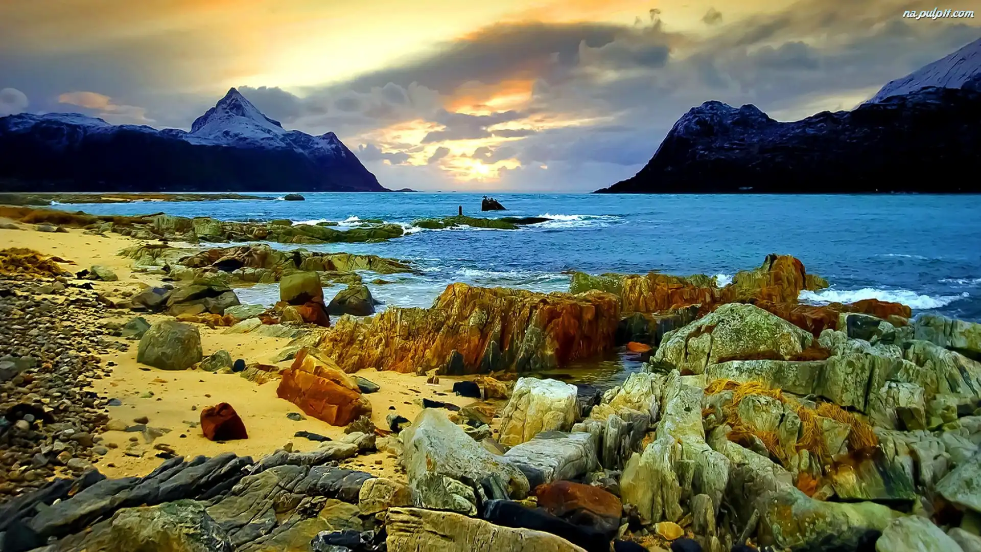 domki na plaży, Fale, Plaża, Góry, Morze Kamienie, Brzeg, Morza Jezioro, Góry, Chmurki Góra Płotek na Plaży strumyk, Góry, Kamienie Plaża, Piasek, Kamienie Morze, Kwiatek, Żółty, Plaża Góry, śnieg Kamienie, Skała Mech, Zieleń, Wodospad, Kaskada Plaża, Skały Niebo, Chmura, Góry, Morze Jezioro, Kamienie