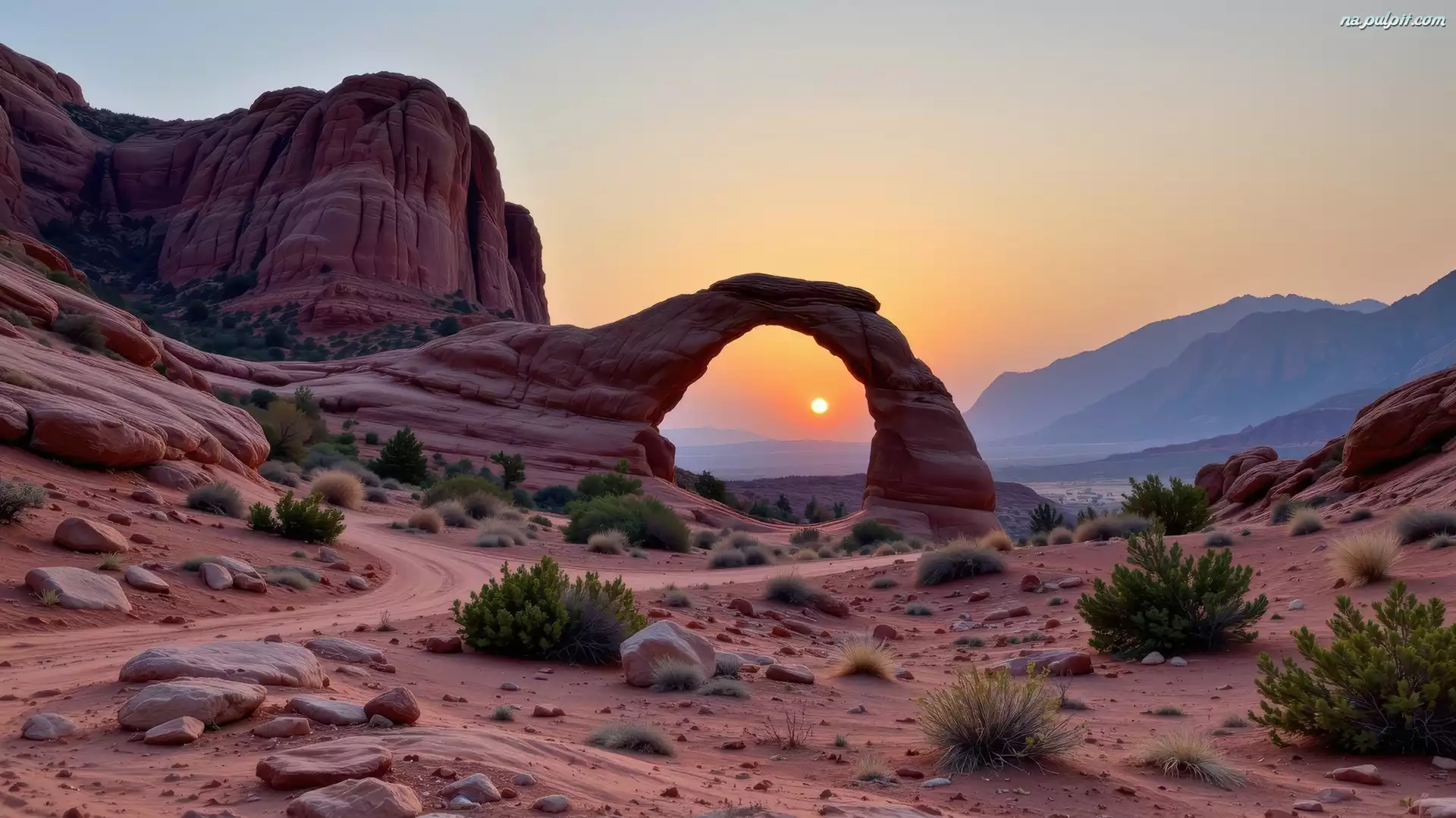 AI, Rośliny, Góry, Skały, Łuk, Wschód słońca, Kamienie Na Pulpit
