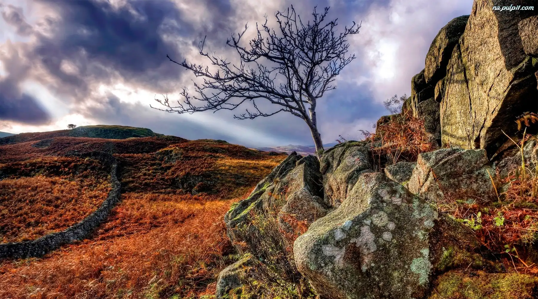 Kamienie, Chmury, Drzewo, Murek, Jesień, Skały Na Pulpit