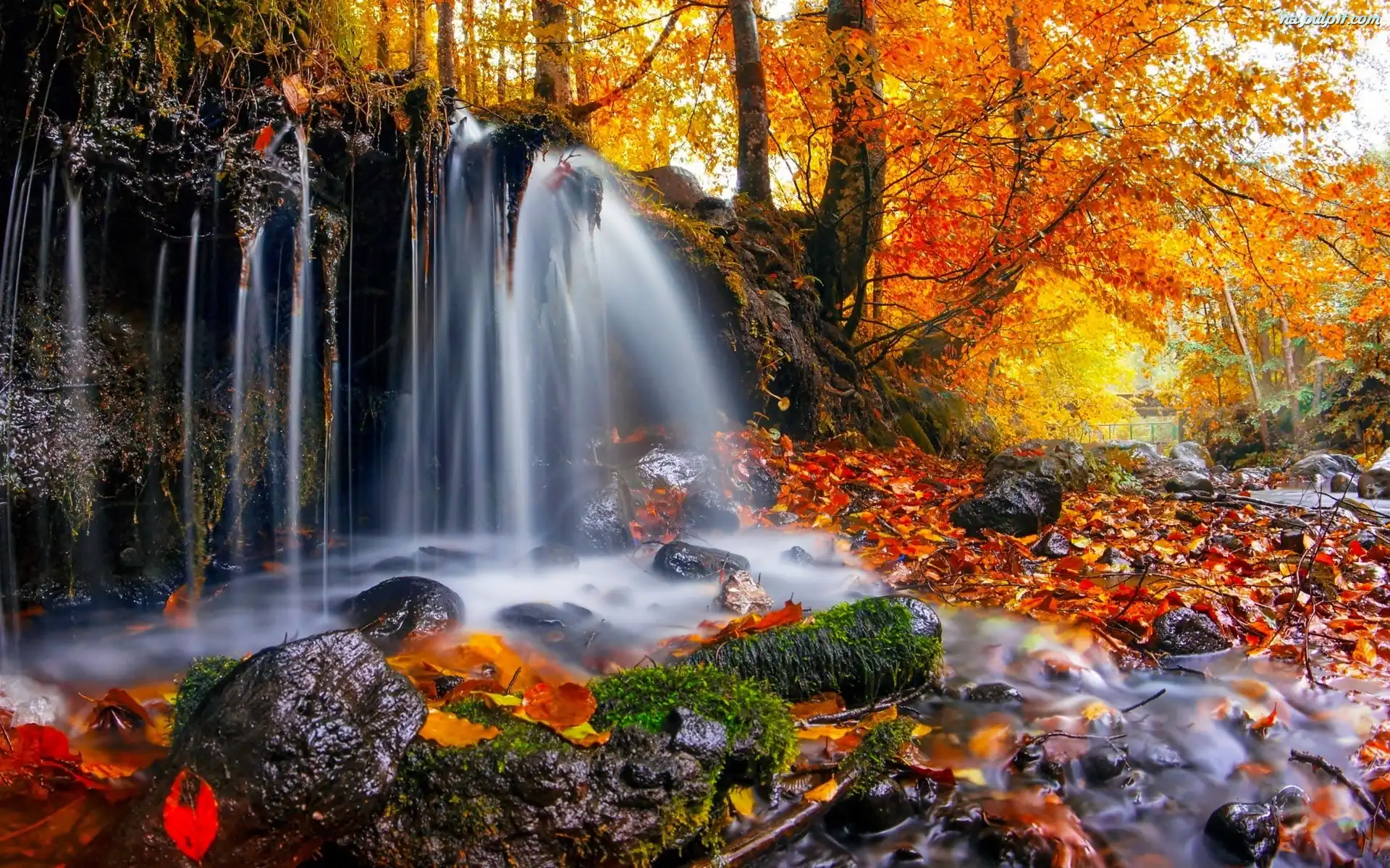 Jesień, Kamienie, Las, Rzeka, Liście, Wodospad, Most