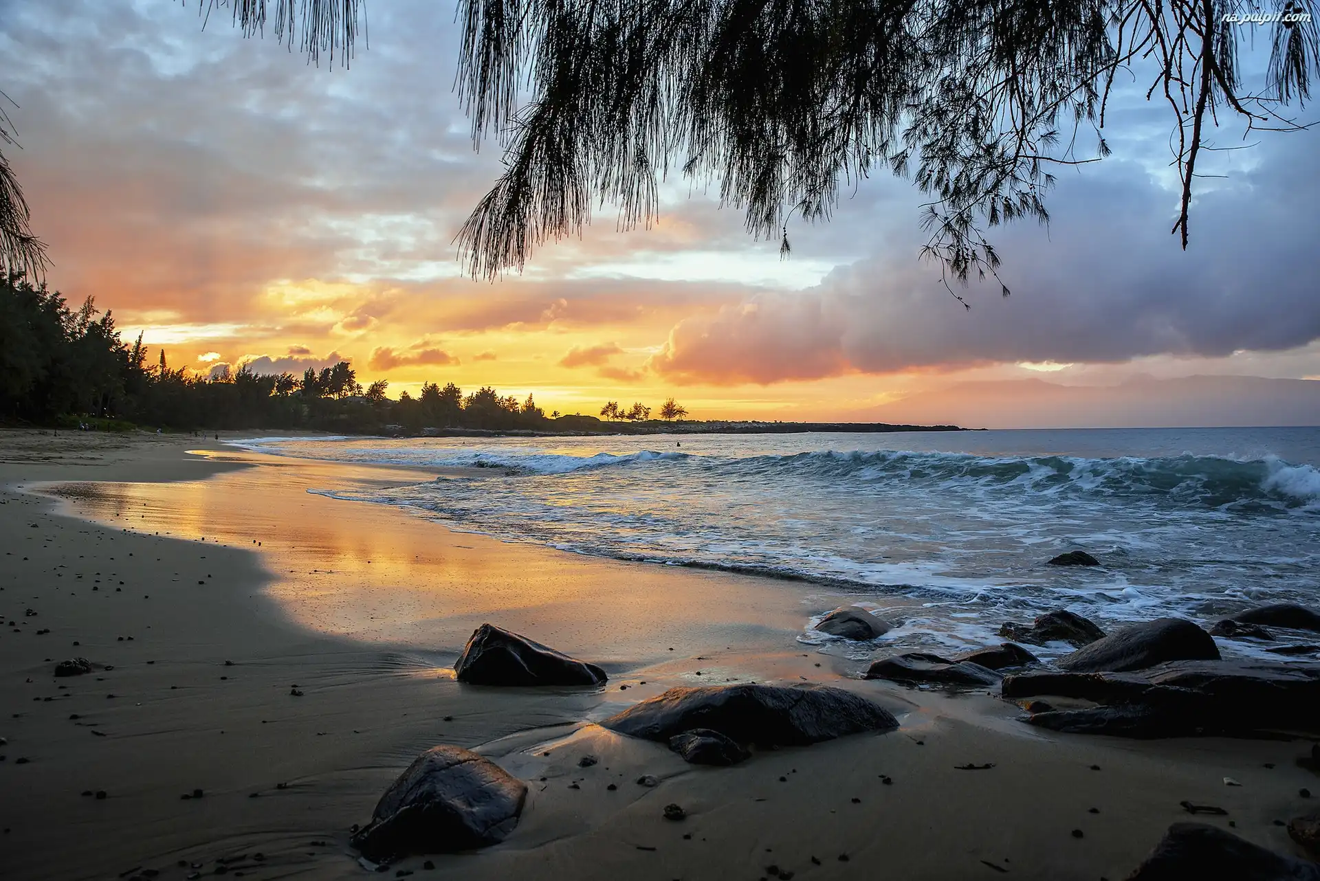 Drzewa, Morze, Plaża, Chmury, Zachód słońca, Fale, Wybrzeże, Kamienie Na Pulpit