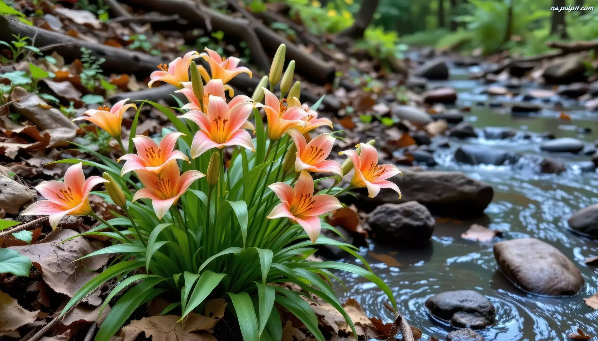Pomarańczowe, Lilie, Strumyk, Kamienie Na Pulpit