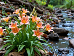 Pomarańczowe, Lilie, Strumyk, Kamienie