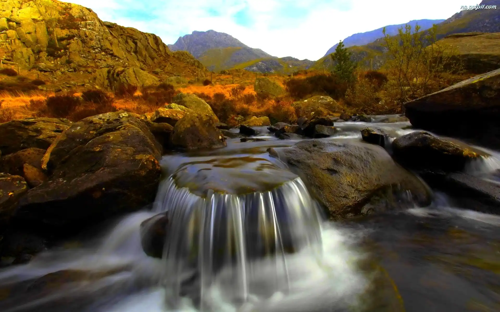Kamienie, Krzewy, Wodospad, Rzeczka, Góry Na Pulpit