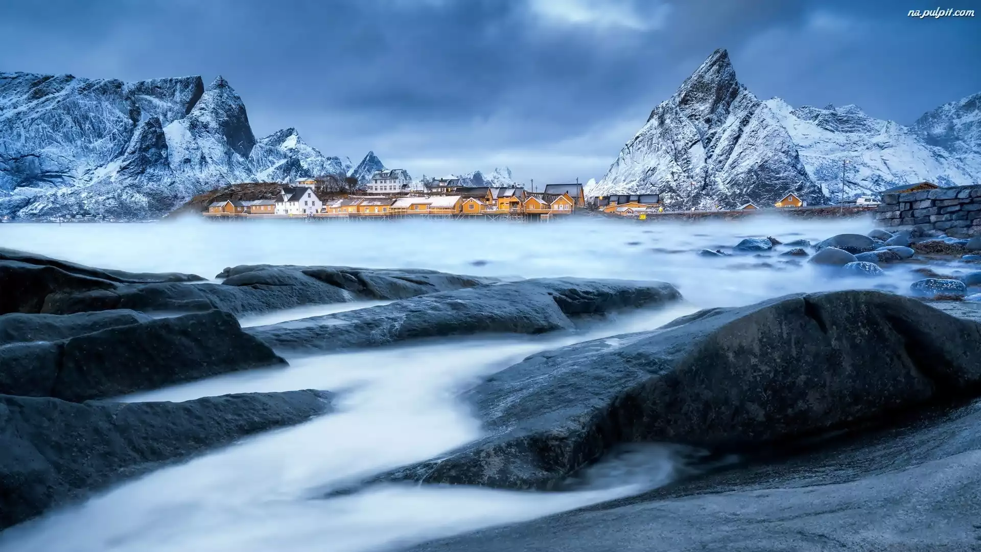 Morze, Lofoty, Zima, Wioska Sakrisøy, Góry, Norwegia, Kamienie Na Pulpit