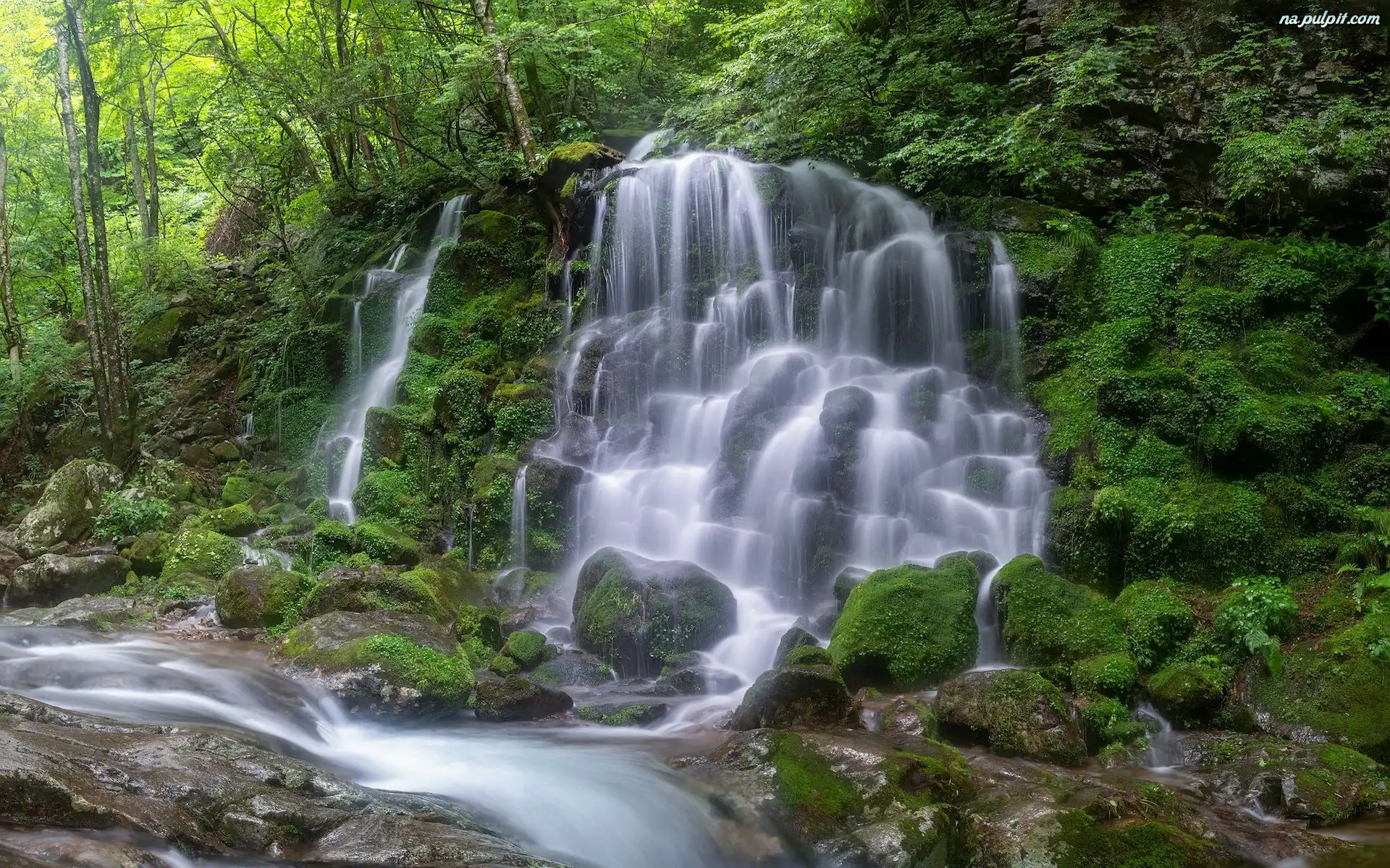 Kamienie, Rzeka, Wodospad, Silbidan Falls, Park Narodowy Jirisan, Korea Południowa, Roślinność, Las, Omszałe Na Pulpit |